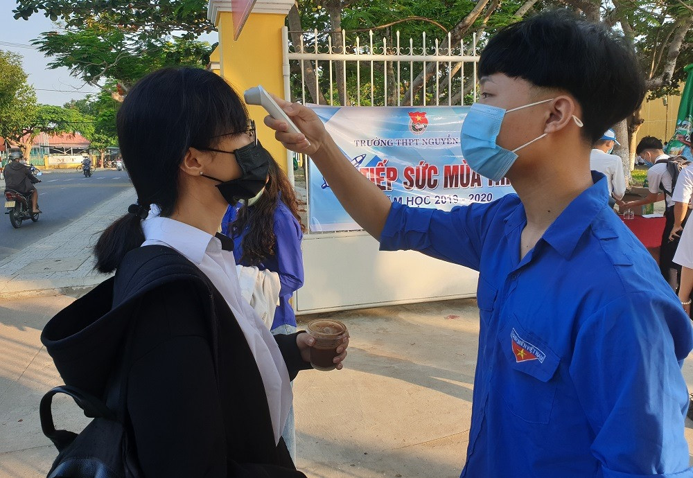 Thí sinh dự thi môn thi đầu tiên kỳ thi tốt nghiệp THPT đợt 2 Theo ghi nhận, nhiều thí sinh ở vùng tâm dịch Quảng Nam có mặt ở điểm thi từ rất sớm và tranh thủ ôn bài để chuẩn bị bước vào thi môn Ngữ văn. Các thí sinh đeo khẩu trang, rửa tay sát khuẩn và đo thân nhiệt trước khi vào phòng thi.