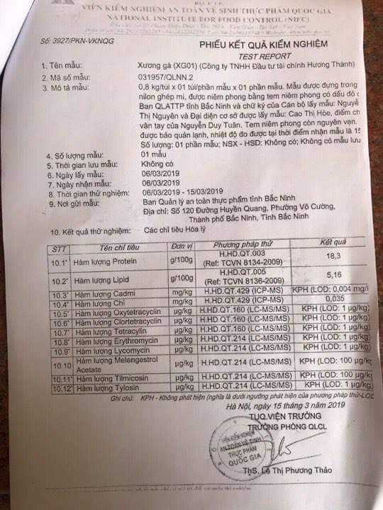Căn cứ kết quả kiểm nghiệm mẫu thịt gà và xương gà tại Trường Mầm non Thanh Khương của Viện Kiểm nghiệm an toàn vệ sinh thực phẩm cho thấy 2 mẫu thực phẩm trên đạt các chỉ tiêu về an toàn thực phẩm.
