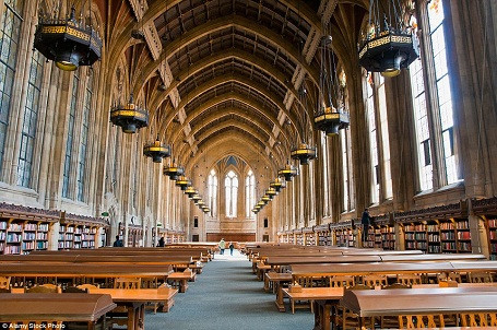 Phòng đọc trong thư viện Suzzallo ở trường Đại học Washington với hai dãy bàn gỗ chạy dài và những dàn đèn treo lơ lửng trong không trung từ trần cao 20m.