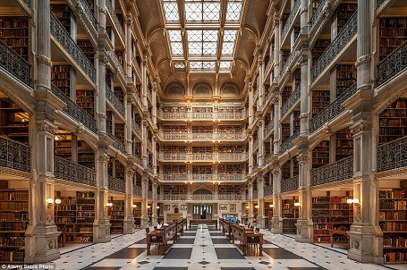 Thư viện George Peabody ở thành phố Baltimore, Mỹ, với 6 tầng lầu là một trong những thư viện đẹp nhất thế giới với hơn 300.000 đầu sách được lưu trữ tại đây, trong số đó có rất nhiều sách cổ từ thế kỷ 18-19.