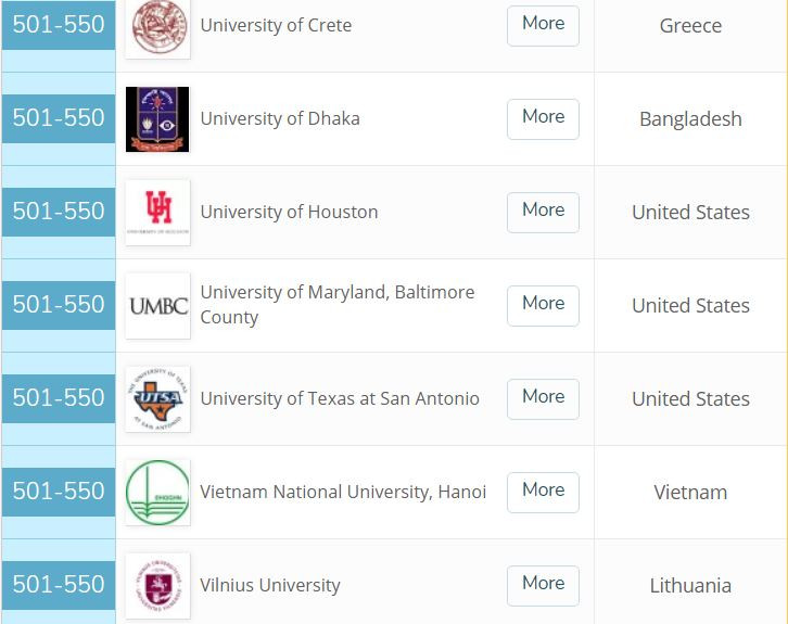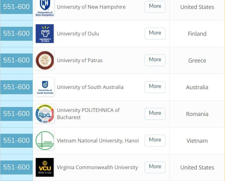 Hai cơ sở giáo dục đại học khác trong nước, ĐH Quốc Gia HCM có 01 lĩnh vực là Khoa học máy tính và Hệ thống thông tin được xếp trong nhóm 551 – 600 thế giới; Trường ĐH Bách Khoa Hà Nội có có 02 lĩnh vực, Khoa học máy tính và Hệ thống thông tin được xếp trong nhóm 451 – 500 và Toán được xếp trong nhóm 451 – 550 thế giới.