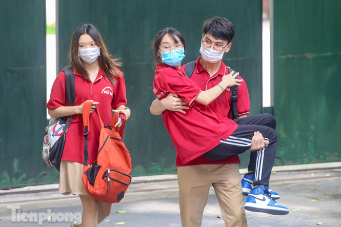 Phó hiệu trưởng Trường THPT Bắc Hà, quận Đống Đa (Hà Nội) cũng cho biết, thí sinh được bạn bế rời điểm thi THPT Phan Huy Chú ở trên là học sinh của trường. Nữ học sinh này bị gãy chân trước kỳ thi 1 tháng. Hiện tại, thí sinh đã tập chủ động việc đi lại nhưng có thể thi xong bài thi môn Ngữ văn, thí sinh bị mệt nên bạn bè hỗ trợ bế em rời điểm thi sáng nay.