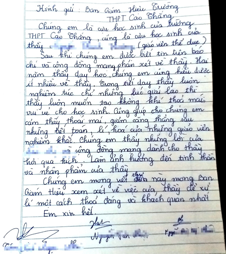 Theo nội dung bức thư: “Chúng em là cựu học sinh của Trường THPT Cao Thắng, cũng là cựu học sinh của thầy N.T.H. (giáo viên thể dục). Chúng em được biết tin trên báo, và cộng đồng mạng phán xét về thầy. Hai năm thầy dạy học, chúng em cũng hiểu được ít nhiều về thầy. Trong tiết dạy thầy luôn nghiêm túc, chỉ những lúc giải lao thì thầy luôn muốn tạo không khí thoải mái vui vẻ cho học sinh. Cũng giúp cho chúng em thấy thoải mái, giảm căng thẳng sau những tiết toán, lý, hóa của những giáo viên nghiêm khắc… Chúng em viết thư này mong Ban giám hiệu xem xét về việc của thầy, để xử lý một cách thỏa đáng và khách quan…”.