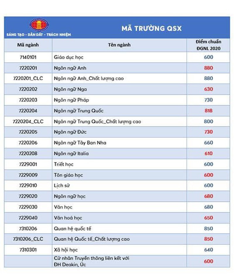 Trong đó, ba ngành có điểm chuẩn cao nhất với 880 điểm, gồm: Ngôn ngữ Anh hệ chuẩn, Ngôn ngữ Anh hệ Chất lượng cao, Truyền thông đa phương tiện. Kế đến là các ngành Quan hệ quốc tế hệ chuẩn, Quan hệ quốc tế hệ Chất lượng cao với 850 điểm. Ngành Tâm lý học và Quản trị dịch vụ du lịch và lữ hành hệ chuẩn cũng có mức điểm khá cao khi lần lượt là 840 điểm và 825 điểm.