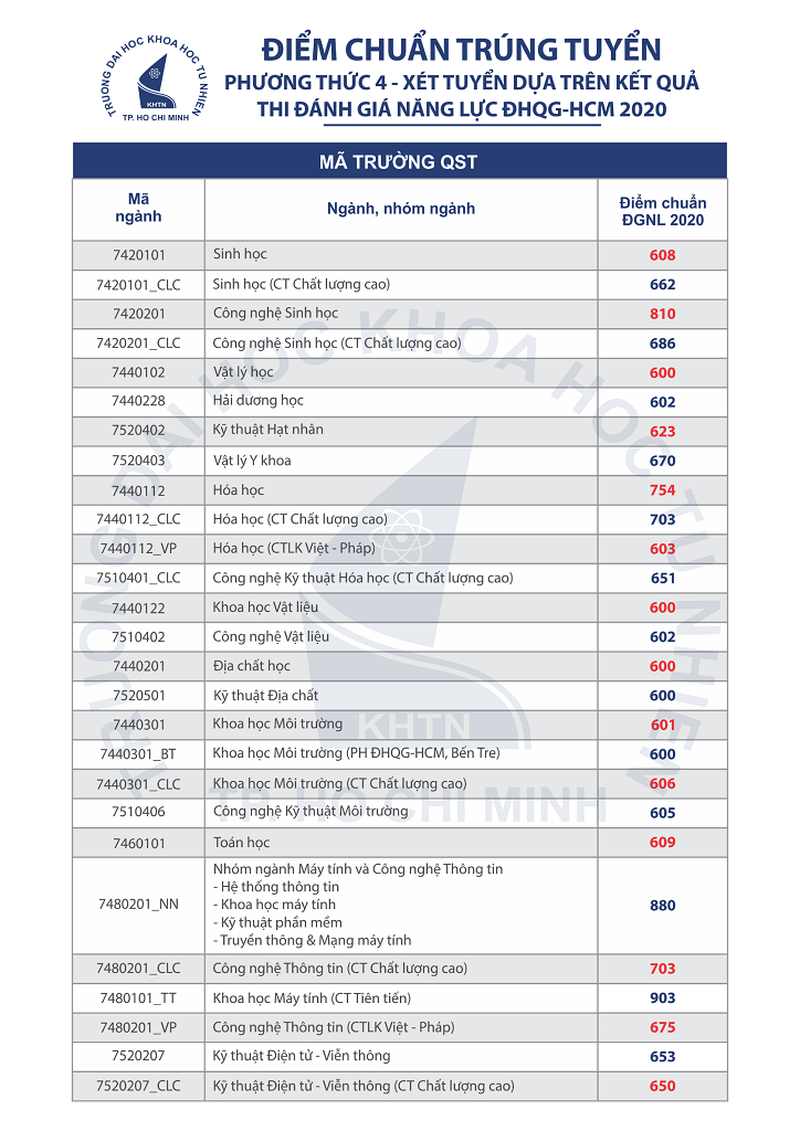 Cụ thể, Hội đồng tuyển sinh Trường ĐH Khoa học Tự nhiên- ĐHQG TPHCM thông báo có 1.485 thí sinh trúng tuyển dựa trên kết quả kỳ thi Đánh giá năng lực do ĐHQG-TPHCM tổ chức năm 2020.