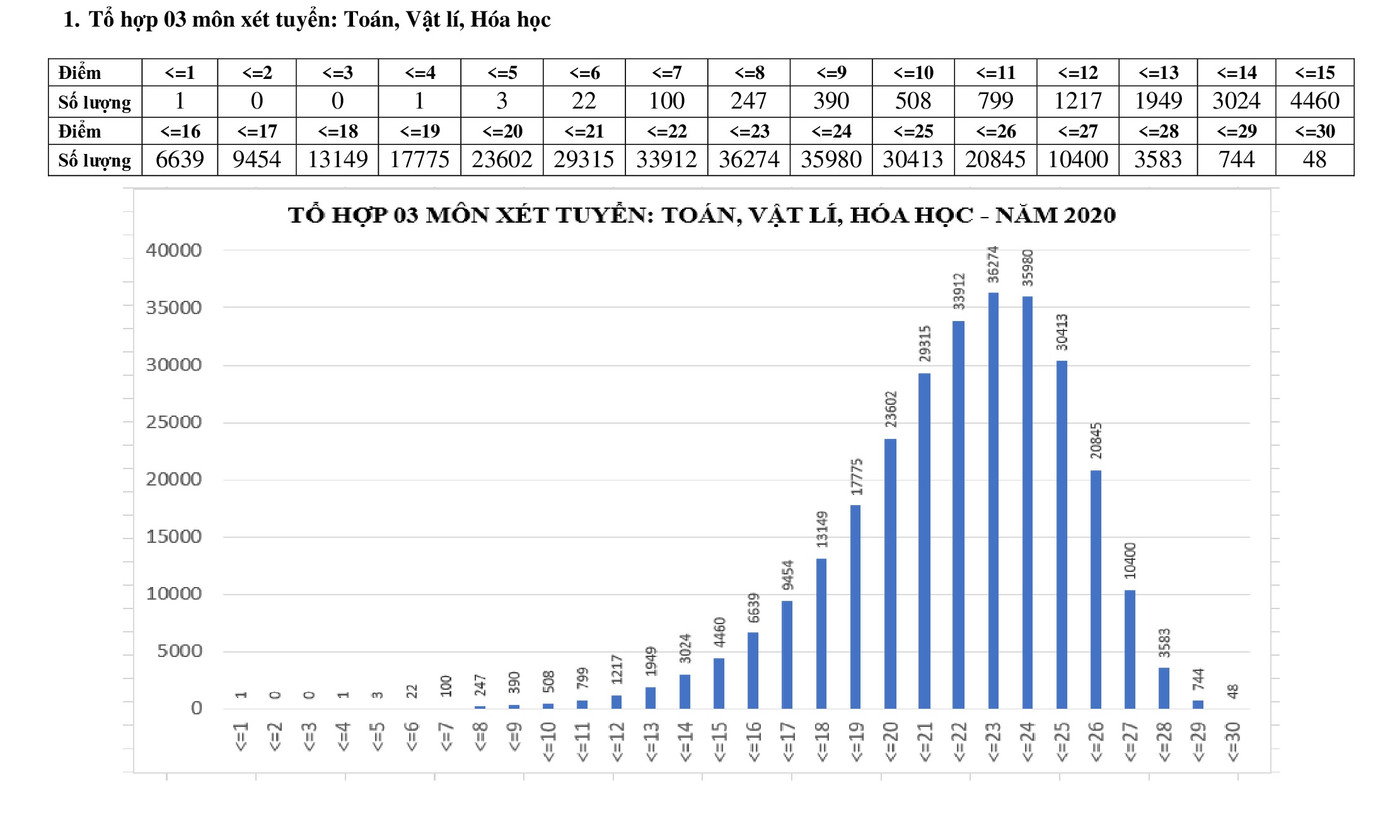 Kết quả phân tích điểm thi theo tổ hợp 03 môn xét tuyển Toán, Vật lí, Hóa học (A00) cho thấy: Điểm trung bình là 21,46 điểm, điểm trung vị là 21,9 điểm; tổng điểm có nhiều thí sinh đạt nhất là 23 điểm.