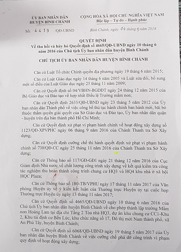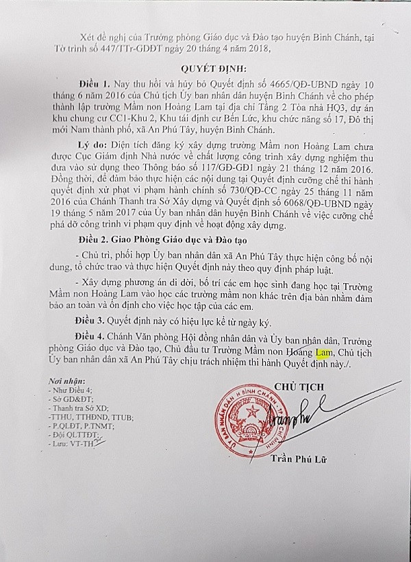 Theo tìm hiểu của PV, việc thu hồi giấy phép của trường được thực hiện theo quyết định do Chủ tịch UBND huyện Bình Chánh ký vào ngày 4/5/2018. Quyết định này thu hồi và hủy bỏ quyết định 4665/QĐ-UBND được Chủ tịch UBND huyện này ký tháng 6/2016 cho phép thành lập Trường mầm non Hoàng Lam.