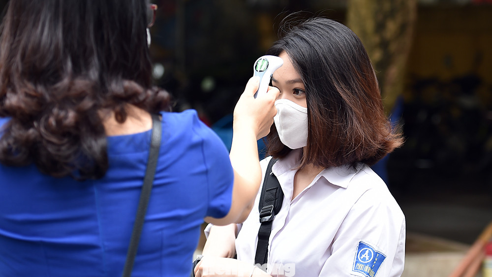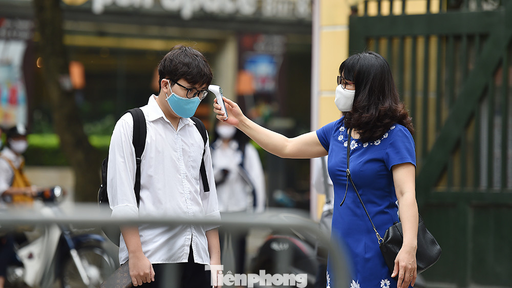 Học sinh dược đo thân nhiệt ngay cổng trước khi bước vào sân trường.