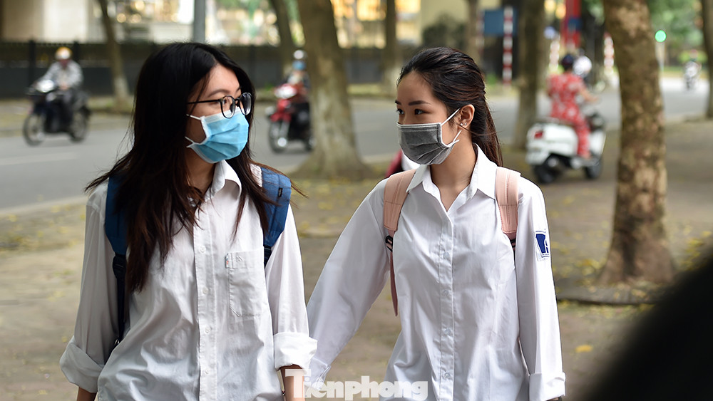 Học sinh trường THPT Phan Đình Phùng (Ba Đình, Hà Nội) vui vẻ đến trường sau thời gian dài nghỉ học do dịch Covid-19 gây ra.