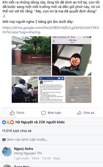 Anh Nguyễn Xuân Lợi chia sẻ: “Con tôi có học trường này từ những ngày ở Trường cũ (gần cầu Khương đình) và nhận thấy phản ánh của Facebook Thu Hà là hoàn toàn đúng sự thật. Tôi cũng là người bị mời lên gặp cô Chủ nhiệm. Nhìn con gái khóc mà xót xa, cháu rất sợ và rất áp lực với mọi việc về trường Lương Thế Vinh... Nghiêm khắc là tốt, nhưng hà khắc, áp đặt làm thui chột trẻ nhỏ. Họp phụ huynh thì chỉ thấy cô dọa là tuổi cấp 2 thay đổi tâm sinh lý lớn nên không thể nhân nhượng...”.