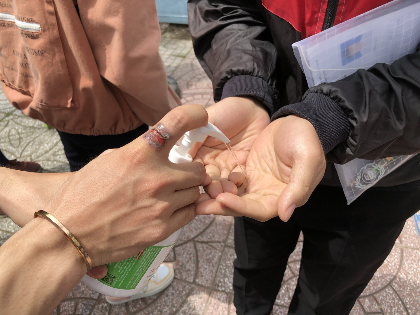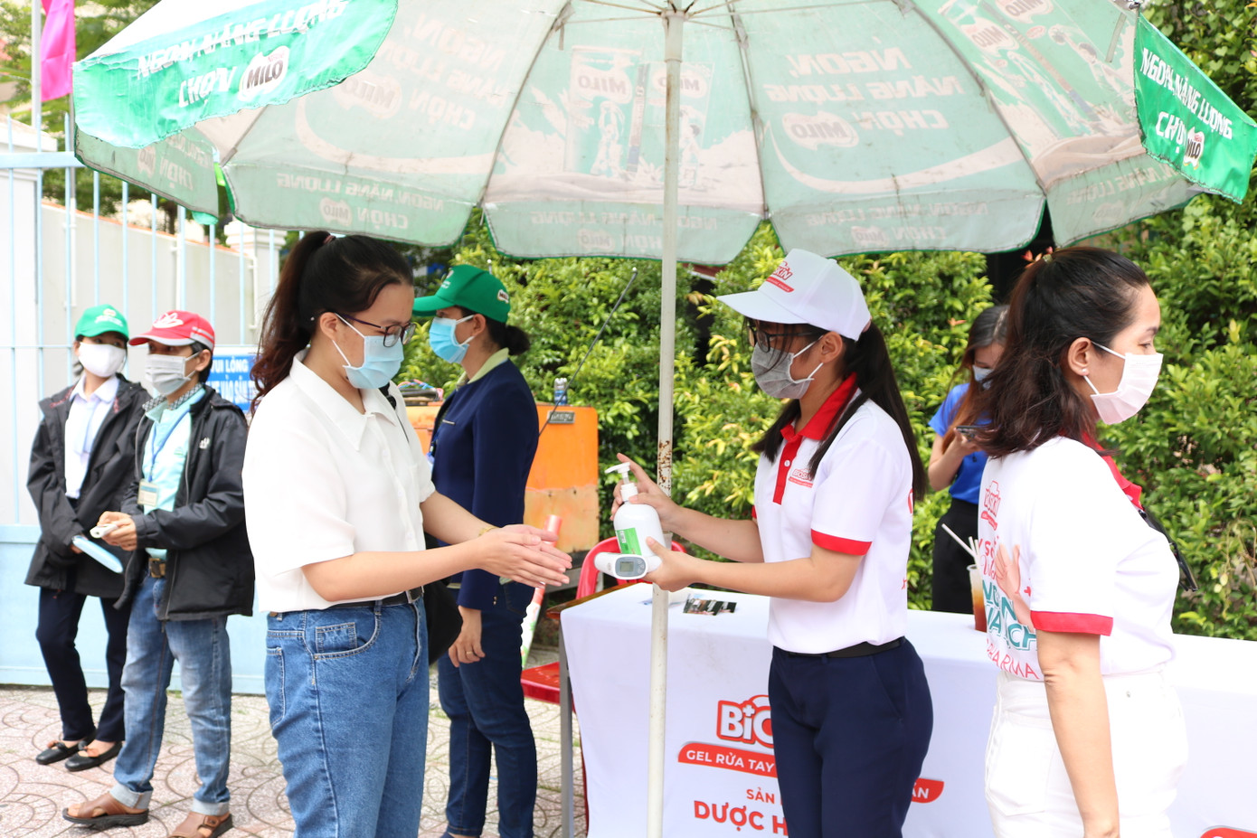 Ngay tại cổng, đội ngũ tình nguyện viên đã trực sẵn, với máy đó nhiệt độ, nước rửa tay sát khuẩn và khẩu trang trên tay để kịp thời kiểm tra thân nhiệt, sát khuẩn cho các thí sinh trước khi vào phòng thi. Đối với những bạn chưa có hoặc quên đeo khẩu trang sẽ được tình nguyện viên phát tặng để đảm bảo an toàn.