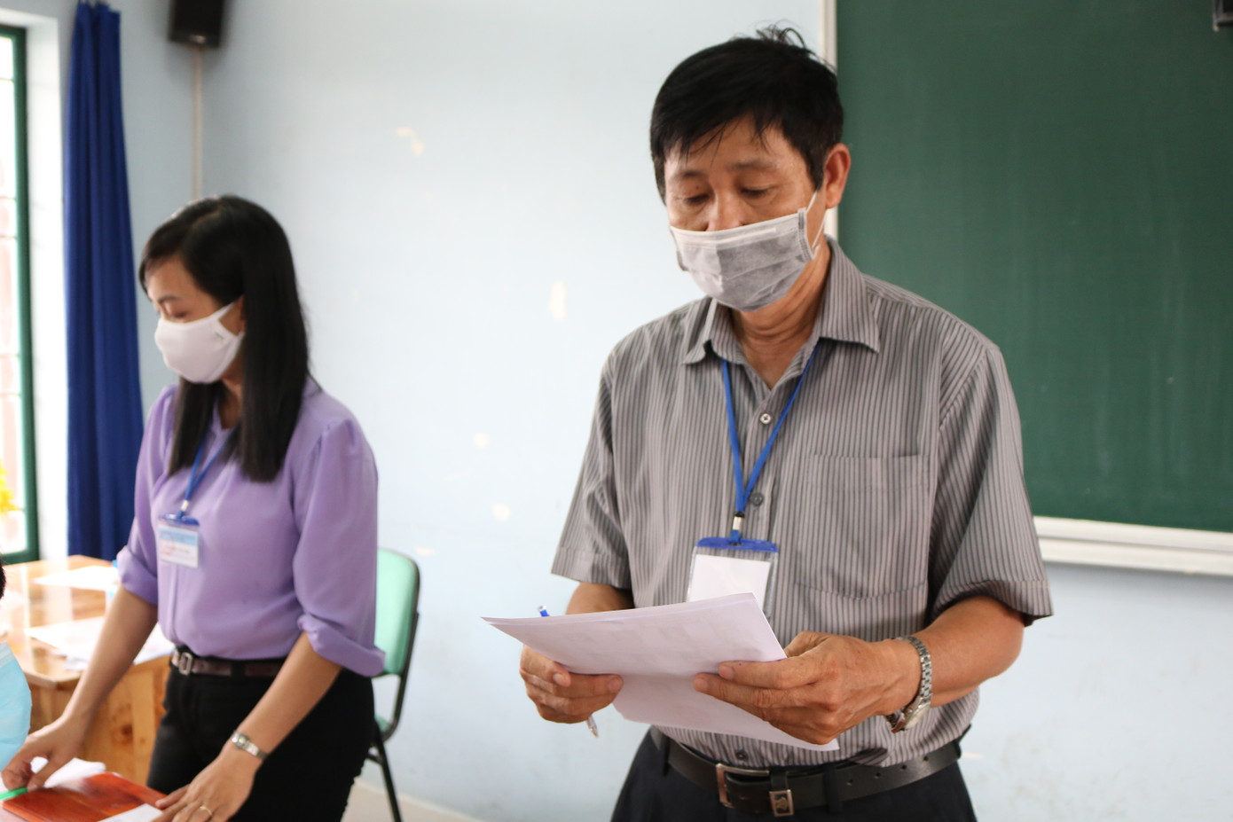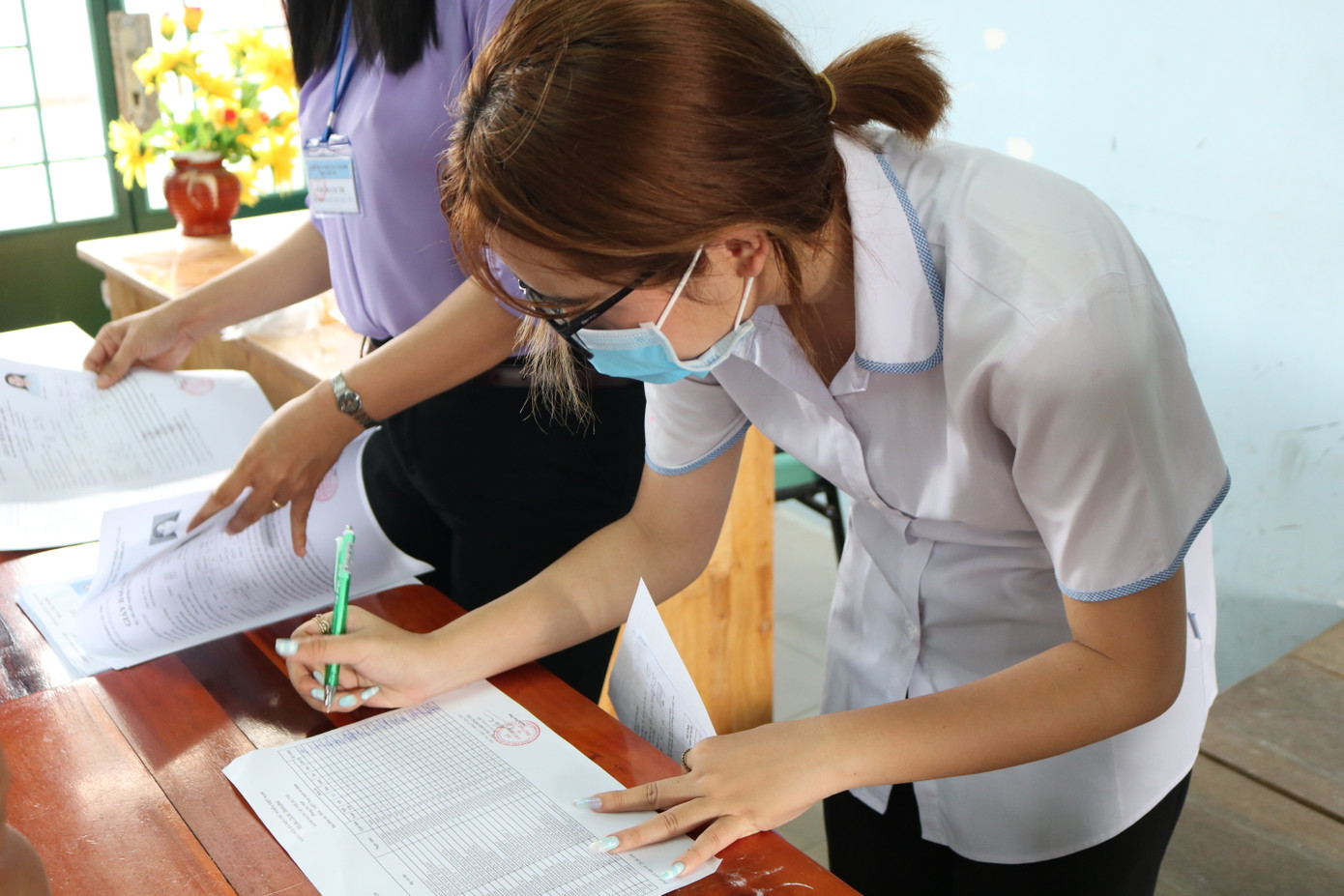 Tất cả thí sinh đều tuân thủ thực hiện các biện pháp phòng chống dịch bệnh - Ảnh: Kim Hà. Sau đó, thí sinh lần lượt đến phòng thi của mình như đã được thông tin trong thẻ dự thi. Tại đây, giám thị sẽ đọc tên, số báo danh để các thí sinh lần lượt vào phòng thi và phổ biến quy chế thi.