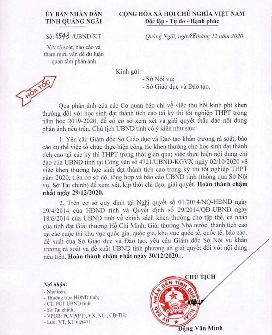 Ngày 29/12, Văn phòng UBND tỉnh Quảng Ngãi cho biết, ông Đặng Văn Minh - Chủ tịch UBND tỉnh vừa ký công văn hỏa tốc yêu cầu các sở rà soát lại việc thu hồi kinh phí khen thưởng học sinh đối với học sinh đạt thành tích cao trong kỳ thi tốt nghiệp THPT trong năm học 2019-2020.