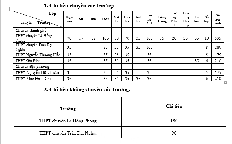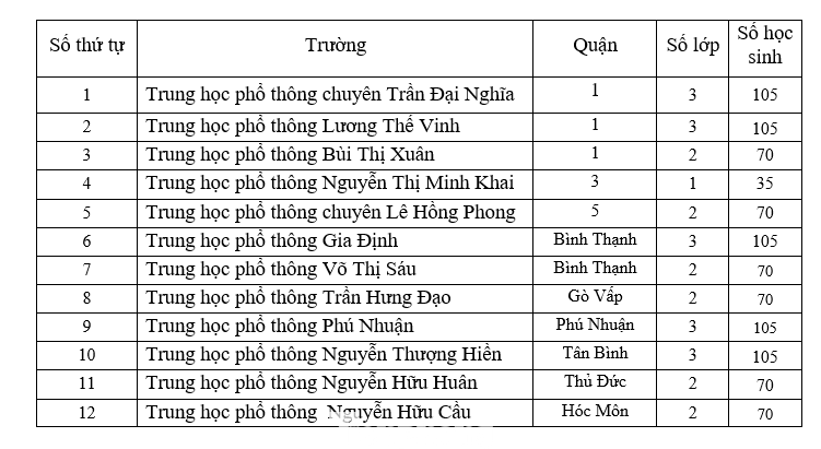 Theo đó, đối với lớp 10 tích hợp, TPHCM có 12 trường THPT tuyển 980 chỉ tiêu. Chỉ tiêu các trường cụ thể như sau: