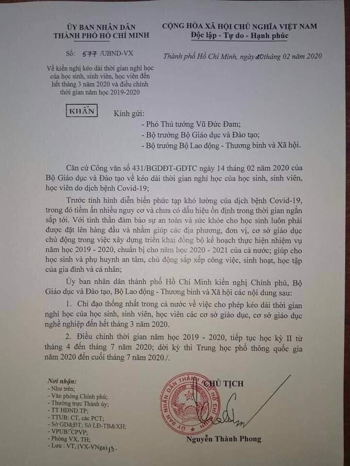 Trước đó, UBND TPHCM cũng đã có quyết định cho học sinh, sinh viên nghỉ học hết tháng 2. Sở GD&ĐT TPHCM cũng đã có tờ trình tham mưu về việc cho học sinh nghỉ học đến hết tháng 3 và điều chỉnh thời gian năm học 2019-2020, tiếp tục học kỳ 2 từ tháng 4 đến tháng 7 năm 2020, đồng thời lịch thi THPT quốc gia được lùi lại đến cuối tháng 7.