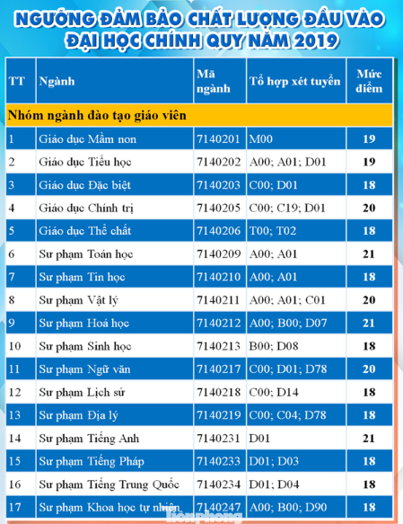 Đa số các ngành thuộc nhóm ngành đào tạo giáo viên có điểm sàn từ 18 điểm trở lên,ngoài ra có một số ngành cao hơn từ 01 đến 02 điểm so với quy định của Bộ Giáo dục và đào tạo về điểm sàn các ngành đào tạo giáo viên để đảm bảo chất lượng đầu vào cũng như chất lượng đào tạo.