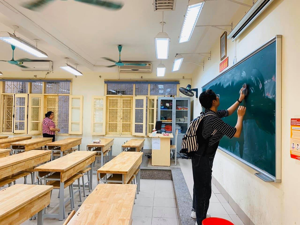 Tại trường THCS Chương Dương (quận Hoàn Kiếm), sau khi Trung tâm y tế tiến hành khử khuẩn, các thầy cô giáo đã tiến hành tổng vệ sinh lớp học.
