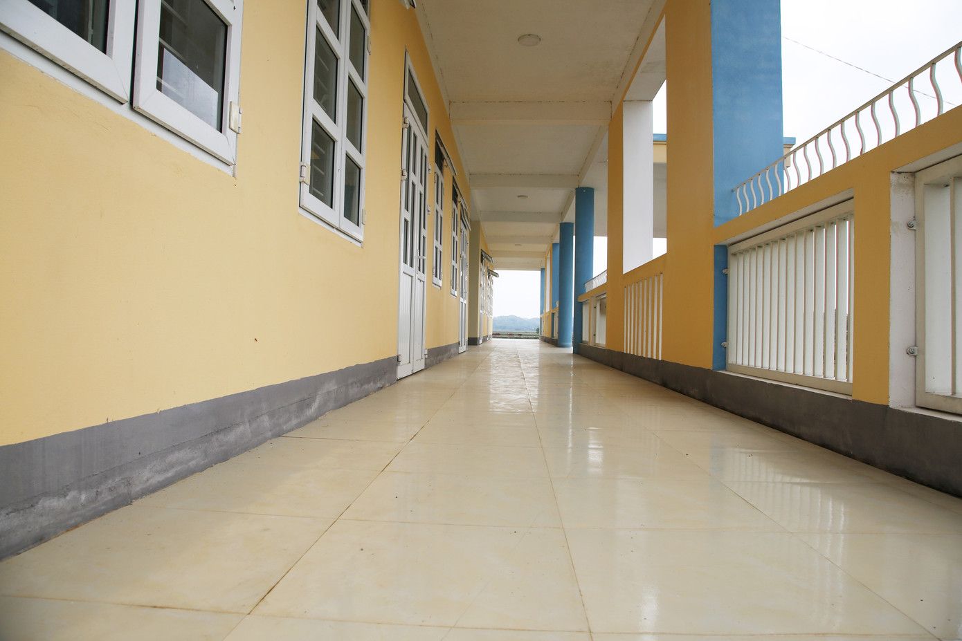 Qua quan sát, công trình dãy nhà hai tầng này được xây dựng giữa bãi đất trống, cổng trường, hàng rào, khuôn viên bên trong chưa được hình thành. Từ bên ngoài nhìn dãy nhà trơ trọi giữa cánh đồng bao la, không có người trông coi hay bảo vệ.