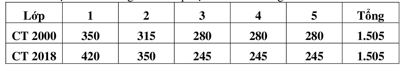 Tuy nhiên, số tiết cho lớp 1 và lớp 2 trong chương trình 2018 có tăng (2 tiết/tuần cho lớp 1 và 1 tiết/tuần cho lớp 2) so với chương trình 2000; ngược lại số tiết cho lớp 3, 4, 5 trong chương trình 2018 lại giảm.