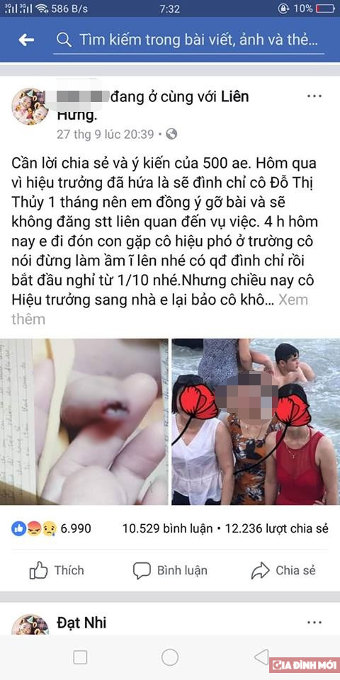 Theo đó, ngày 27/9, facebook cá nhân Đ.N chia sẻ, một giáo viên Đ.T.T - chủ nhiệm lớp 3 tuổi, trường Mầm non Liên Am đã đánh chảy máu, rách đầu bộ phận sinh dục con trai người này khi cháu nói chuyện riêng trong lớp.