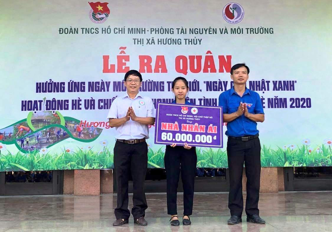 Dịp này, Thị Đoàn Hương Thủy còn phối hợp với Hội Chữ thập Đỏ thị xã khởi công công trình thanh niên “Nhà nhân ái” hỗ trợ gia đình em Dương Ngọc Kiều Linh (học sinh lớp 10 Trường THPT Phú Bài; với trị giá hỗ trợ 60 triệu đồng); trao 10 suất quà (300 ngàn đồng/suất) cho học sinh có hoàn cảnh khó khăn trên địa bàn.