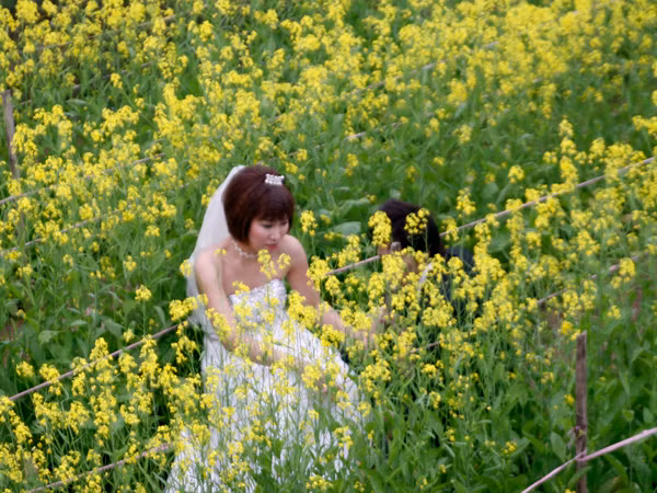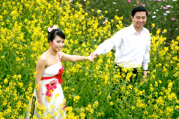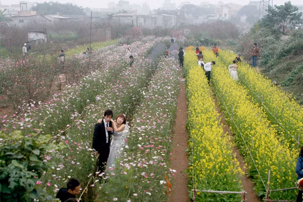 | Các đôi uyên ương xuống ruộng hoa Quảng Bá chụp ảnh. |