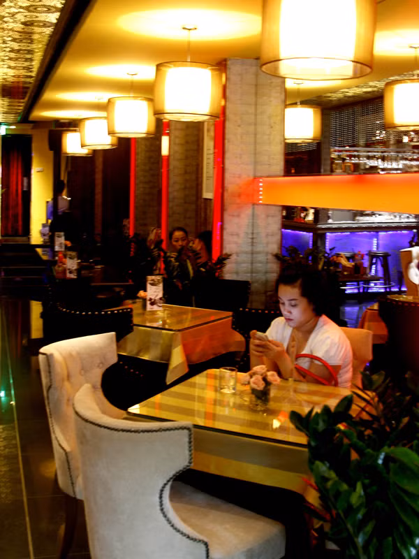 Còn nét Ả-rập được là nơi tầng hai, tầng ba. Ánh đèn nhiều màu sắc, huyền ảo, những tấm thảm lớn chải dài, tấm rèm mong buông, gối nhung, ghế đệm… Ở đây bạn có sự lựa chọn ngồi ghế lịch, hoặc thoải mái ở góc ngồi bệt trên những tấm thảm.