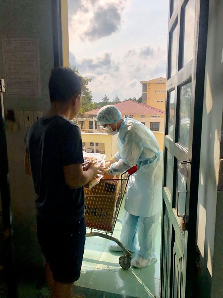 Các nhân viên y tế mang đồ ăn tới từng phòng.