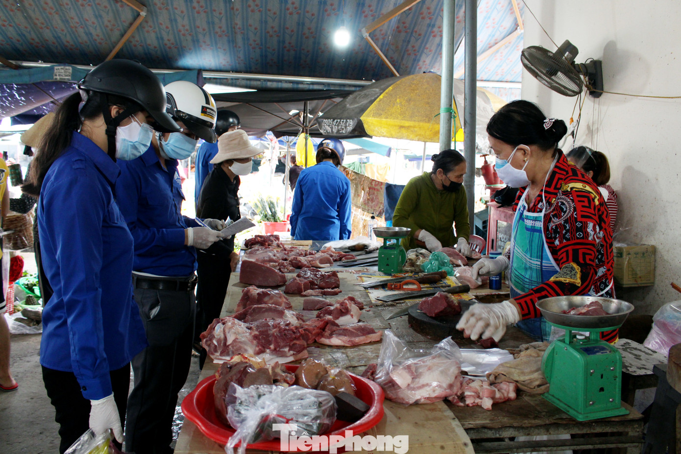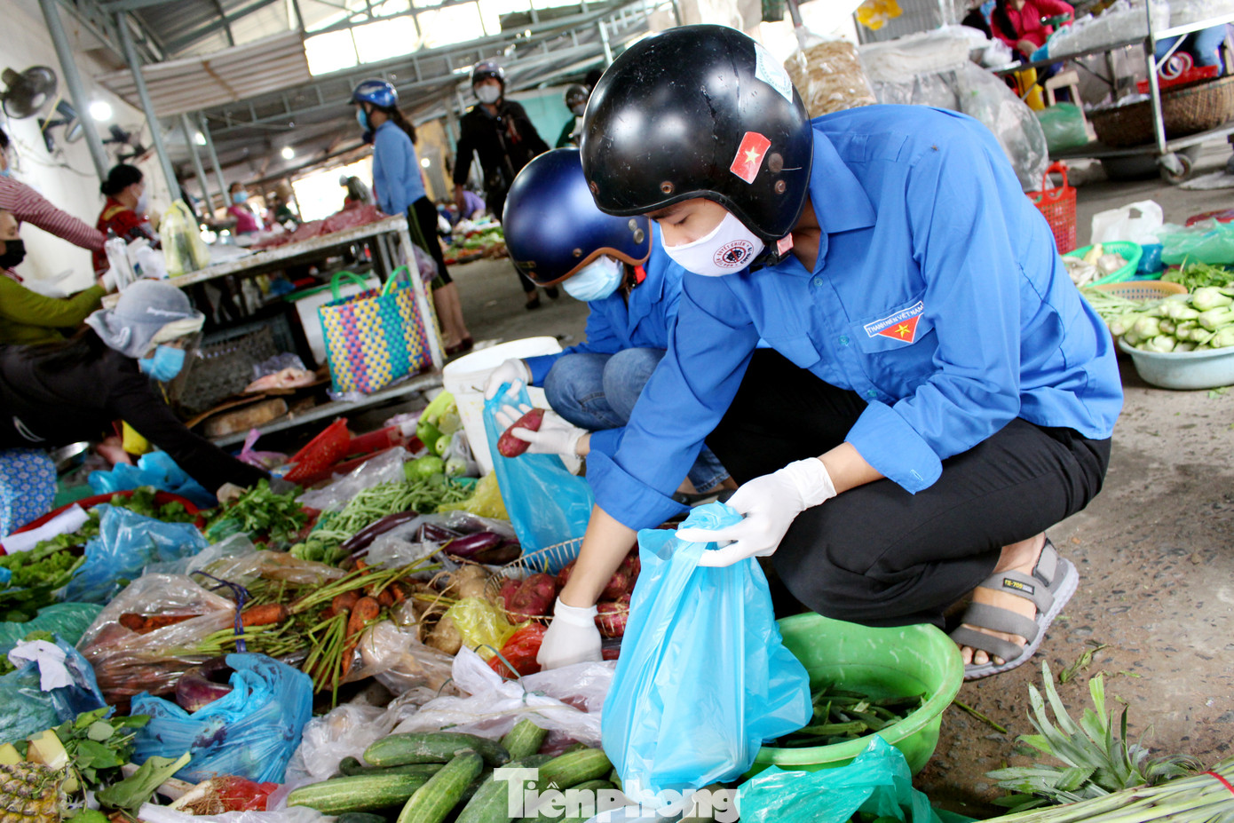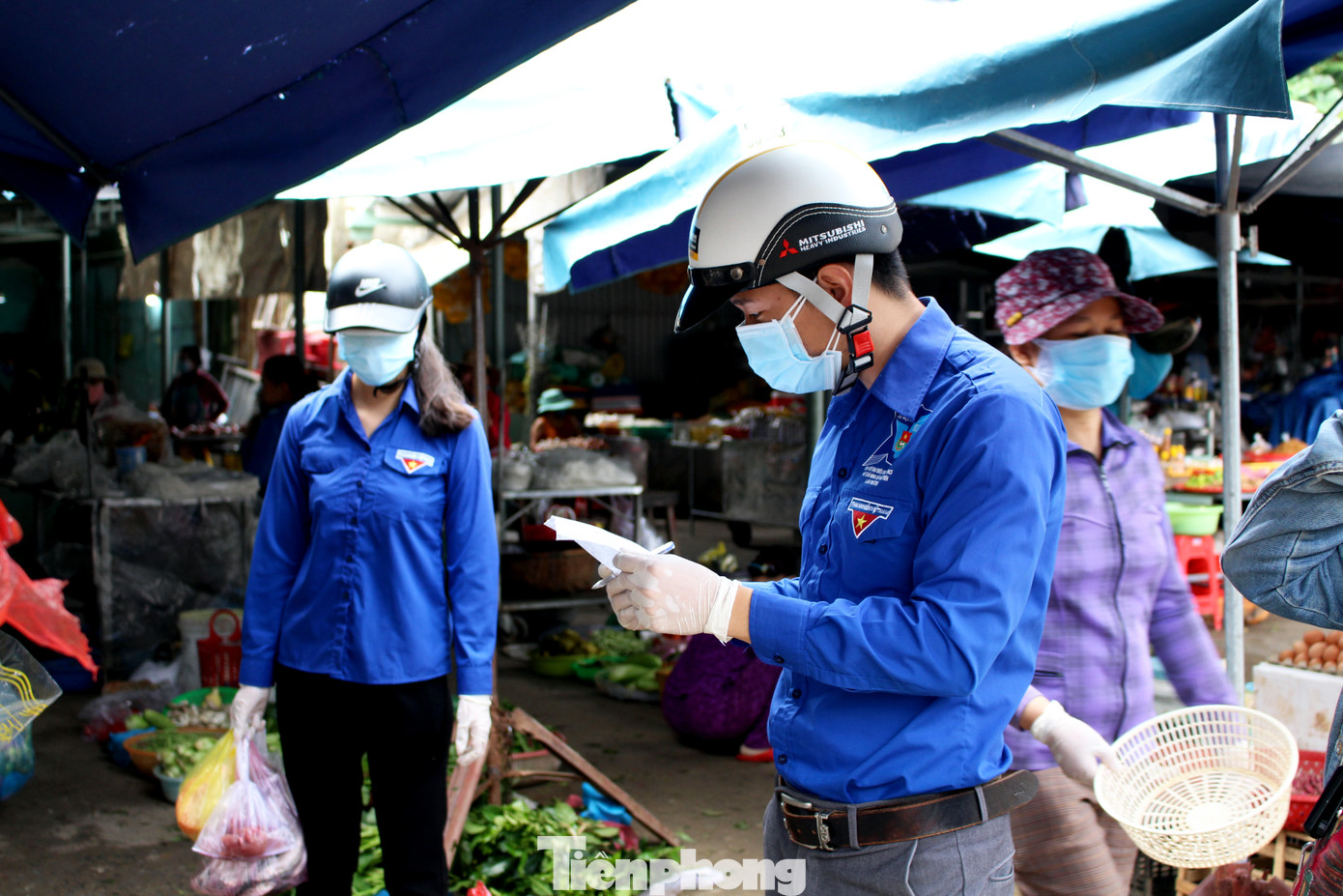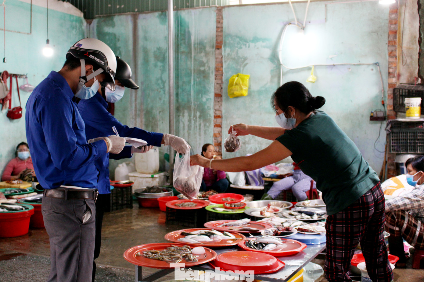 Dù 2 nhóm chia nhau làm việc liên tục mỗi buổi sáng, nhưng chưa bao giờ tiếp xúc hay trò chuyện với nhau để đảm bảo các yêu cầu phong tỏa. Tiền chợ sau khi thu về sẽ được 1 TNV đặt ở bàn, sau đó, 1 TNV ngoài khu phong tỏa sẽ vào nhận, đem khử khuẩn bằng cồn rồi mang về. Ảnh: Giang Thanh
