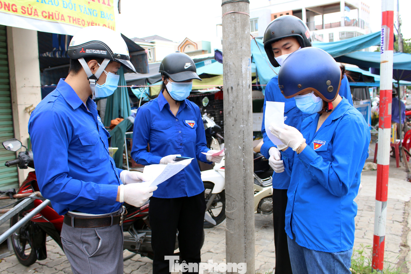 Từ 9h sáng, các thành viên trong đội "Đi chợ giúp dân" thôn Yến Nê 2 (xã Hòa Tiến, huyện Hòa Vang, Đà Nẵng) đã có mặt trước cổng chợ Lệ Trạch để chuẩn bị bắt đầu công việc. Các TNV rà soát kỹ danh sách các hộ và thực phẩm cần mua trước khi vào chợ. Ảnh: Giang Thanh