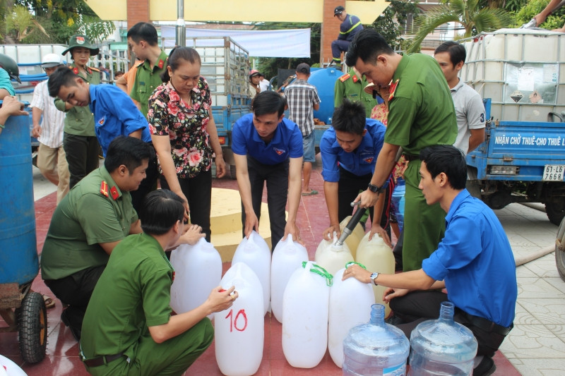 Đoàn thanh niên công an tỉnh chở hàng trăm khối nước về tận nơi hỗ trợ cho người dân bị hạn mặn