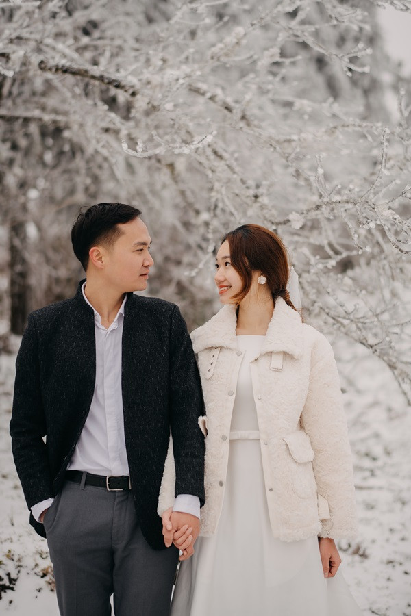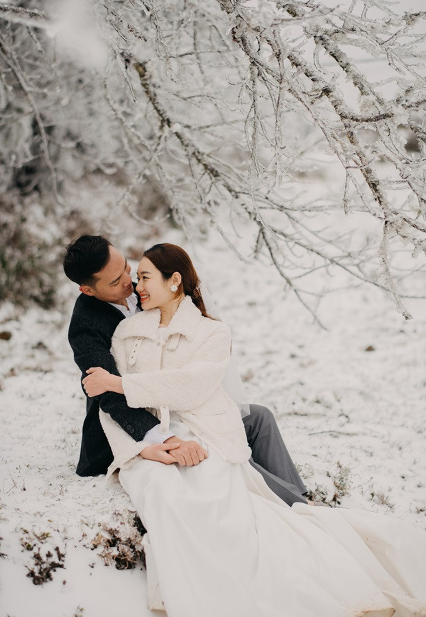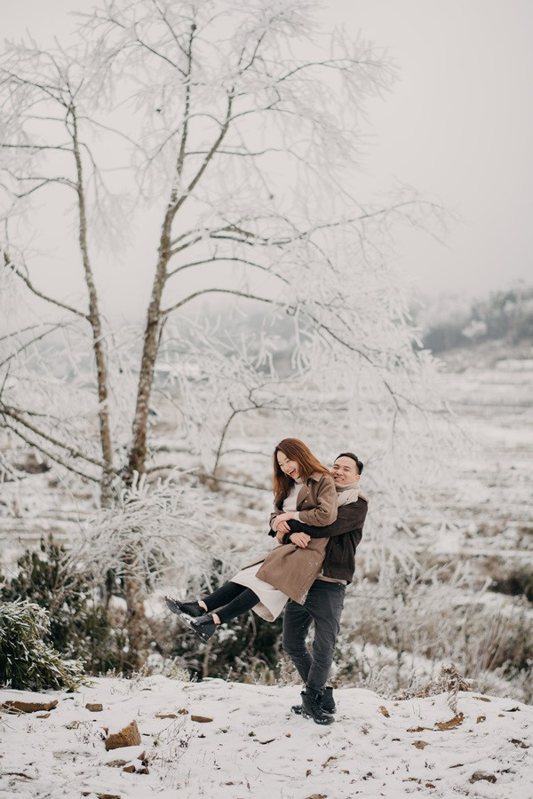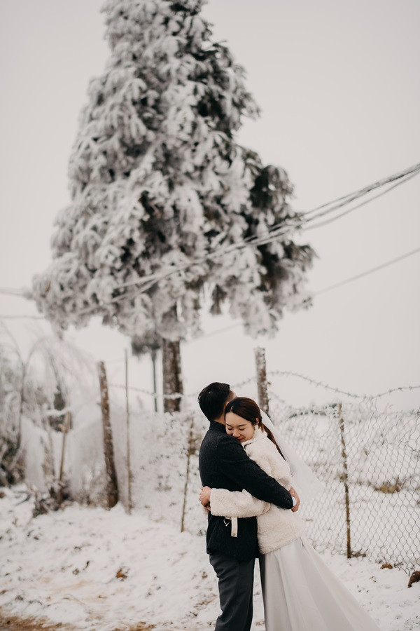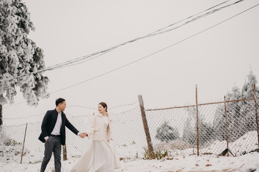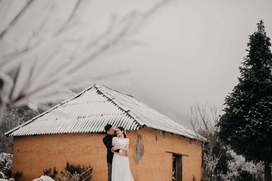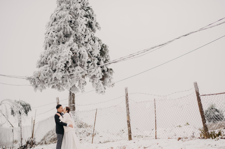 Bộ ảnh cưới tuyết trắng đến với chúng tôi vô cùng bất ngờ, đến bây giờ tôi chỉ nghĩ đó thật sự là duyên. Lúc đầu định đi săn mây, khi thời tiết dự báo mùng 8, 9 có thể có tuyết rơi tại Sapa, tôi đã muốn đi nhưng do công việc không thể bỏ được, nên tôi nghĩ mình chưa có duyên thấy tuyết, nhưng hai hôm đó lại chưa có tuyết, đêm ngày 10 thời tiết lại báo khả năng có tuyết, trong đầu tôi chỉ thoáng nghĩ đi thử xem sao. Vậy là tôi nhắn cho cả nhóm sắp xếp. 12 giờ đêm ngày 10/1, chúng tôi bắt đầu lên đường, tôi là tài xế kiêm chụp ảnh luôn, vì mưa và lạnh nên đường trơn rất khó đi cộng thêm sương mù, cuối cùng 5 giờ sáng chúng tôi đến Sapa, có hơi chút thất vọng vì không thấy tuyết đâu, chúng tôi ăn sáng và đi cà phê, Nhìn thời tiết chúng tôi không thấy tín hiệu gì của tuyết, ngồi cà phê đến 8 giờ 30, lướt mạng thấy Y Tý đang có tuyết rơi nên cả nhóm chúng tôi phi ngay lập tức, đường khá khó đi, nhưng ai cũng rất vui, đi đc tầm 50 km, chúng tôi cũng đã thấy xuất hiện tuyết rơi. Tất cả mừng như lũ trẻ, thật sự sung sướng, không đợi lâu chúng tôi bắt đầu chụp, trở ngại lớn nhất chính là cái lạnh âm 4 độ, đến mức váy cưới cũng đóng băng lại, nhưng có niềm tin sẽ có bộ ảnh đẹp, nên hầu như mọi lo âu đều tan biến.