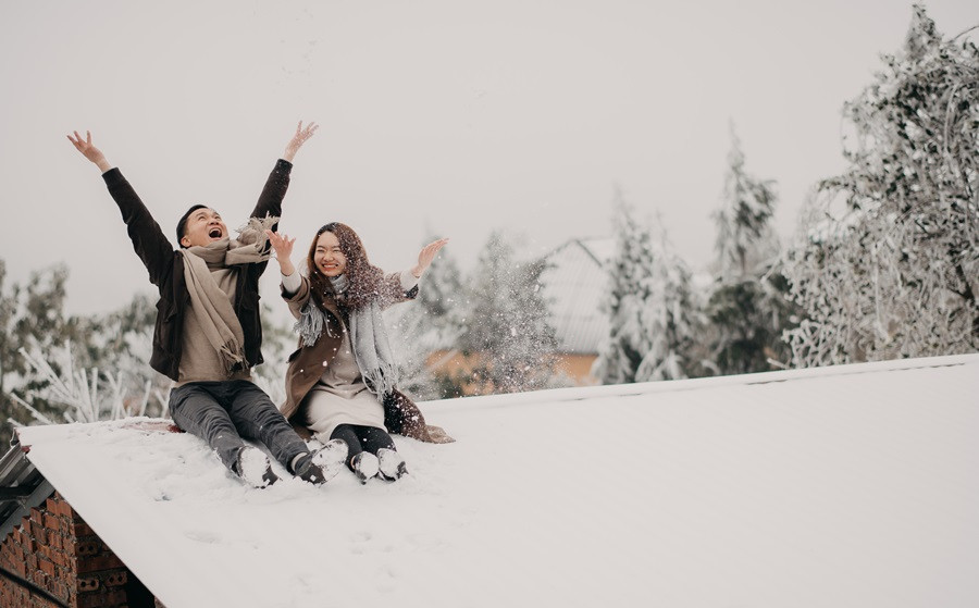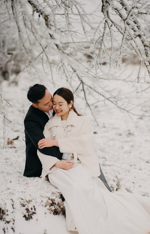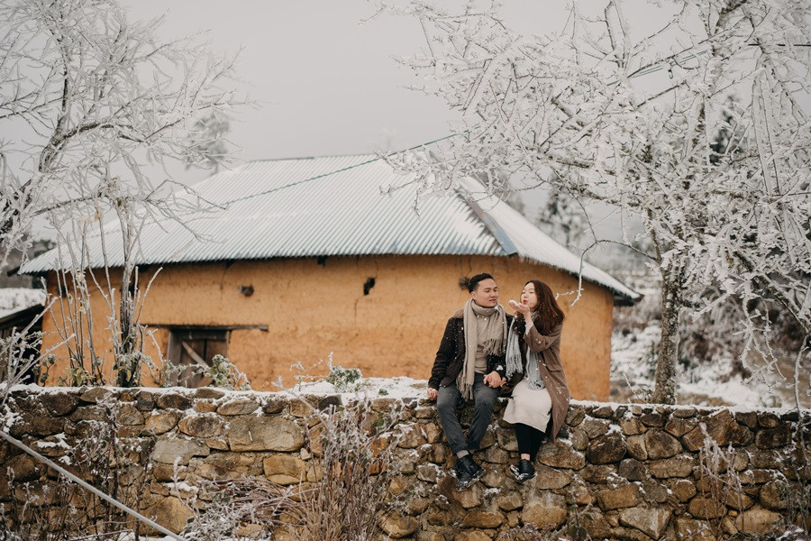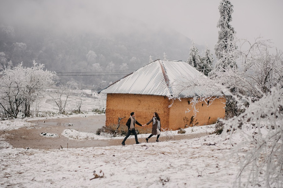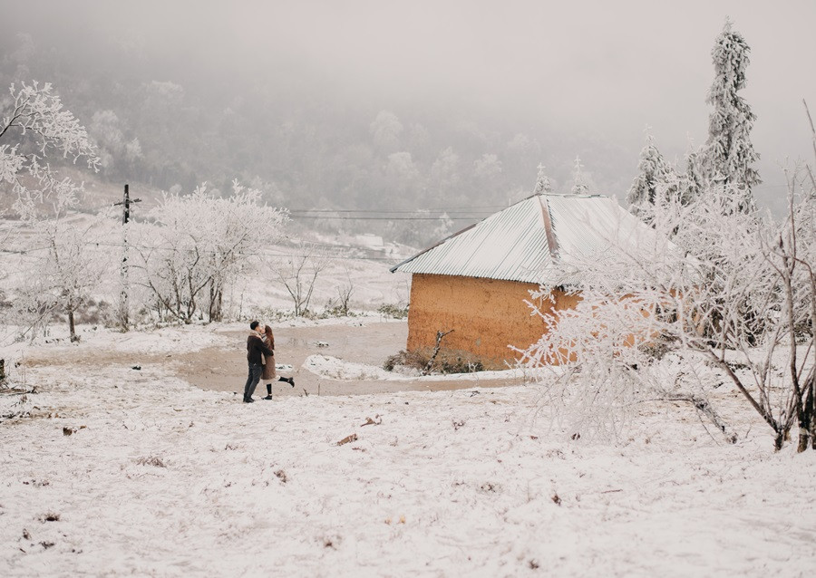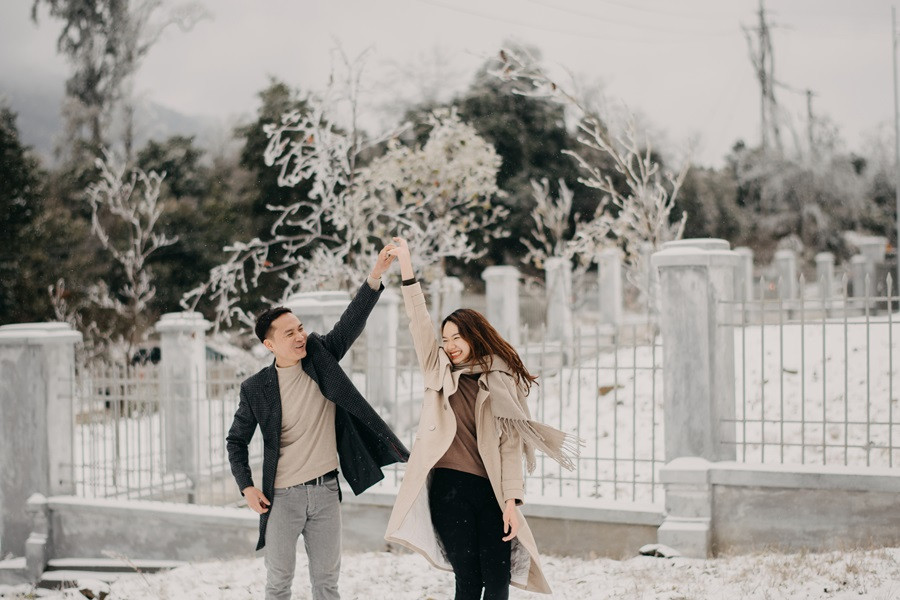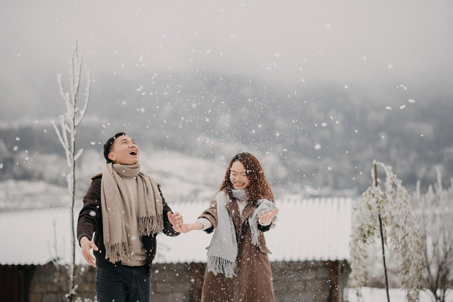 Bộ ảnh cưới tuyết trắng đến với chúng tôi vô cùng bất ngờ, đến bây giờ tôi chỉ nghĩ đó thật sự là duyên. Lúc đầu định đi săn mây, khi thời tiết dự báo mùng 8, 9 có thể có tuyết rơi tại Sapa, tôi đã muốn đi nhưng do công việc không thể bỏ được, nên tôi nghĩ mình chưa có duyên thấy tuyết, nhưng hai hôm đó lại chưa có tuyết, đêm ngày 10 thời tiết lại báo khả năng có tuyết, trong đầu tôi chỉ thoáng nghĩ đi thử xem sao. Vậy là tôi nhắn cho cả nhóm sắp xếp. 12 giờ đêm ngày 10/1, chúng tôi bắt đầu lên đường, tôi là tài xế kiêm chụp ảnh luôn, vì mưa và lạnh nên đường trơn rất khó đi cộng thêm sương mù, cuối cùng 5 giờ sáng chúng tôi đến Sapa, có hơi chút thất vọng vì không thấy tuyết đâu, chúng tôi ăn sáng và đi cà phê, Nhìn thời tiết chúng tôi không thấy tín hiệu gì của tuyết, ngồi cà phê đến 8 giờ 30, lướt mạng thấy Y Tý đang có tuyết rơi nên cả nhóm chúng tôi phi ngay lập tức, đường khá khó đi, nhưng ai cũng rất vui, đi đc tầm 50 km, chúng tôi cũng đã thấy xuất hiện tuyết rơi. Tất cả mừng như lũ trẻ, thật sự sung sướng, không đợi lâu chúng tôi bắt đầu chụp, trở ngại lớn nhất chính là cái lạnh âm 4 độ, đến mức váy cưới cũng đóng băng lại, nhưng có niềm tin sẽ có bộ ảnh đẹp, nên hầu như mọi lo âu đều tan biến.
