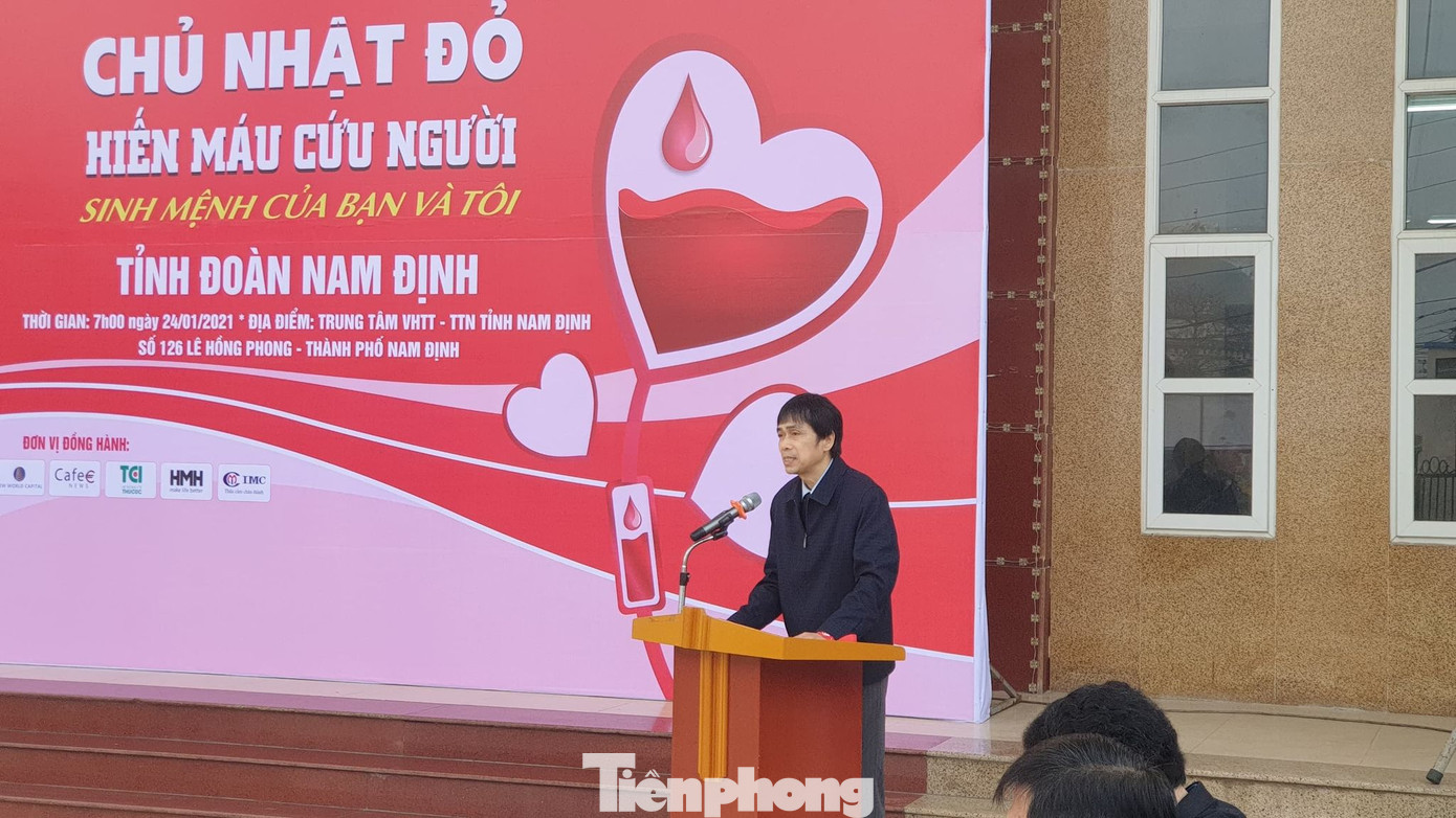 Uỷ viên Ban Biên tập Báo Tiền Phong - ông Nguyễn Huy Lộc phát biểu và thăm hỏi, cảm ơn những người tham gia hiến máu tại chương trình Chủ nhật Đỏ Nam Định - Ảnh: Hoàng Long Cũng theo ông Nguyễn Huy Lộc, chương trình Chủ nhật Đỏ khởi động từ năm 2009, đến nay đã trở thành sự kiện có quy mô toàn quốc góp phần khắc phục tình trạng khan hiếm máu dịp Tết Nguyên đán. Chương trình Chủ nhật Đỏ lần thứ XIII - năm 2021 có sự tham gia của 43 tỉnh thành phố ở cả ba miền Bắc - Trung - Nam; dự kiến tiếp nhận hơn 50 nghìn đơn vị máu. Tính hết ngày 20/1, chương trình đã diễn ra tại 23 tỉnh thành với 45 điểm hiến máu, tiếp nhận gần 36,2 nghìn đơn vị máu, vượt gần 5,8 nghìn đơn vị máu so với dự kiến.