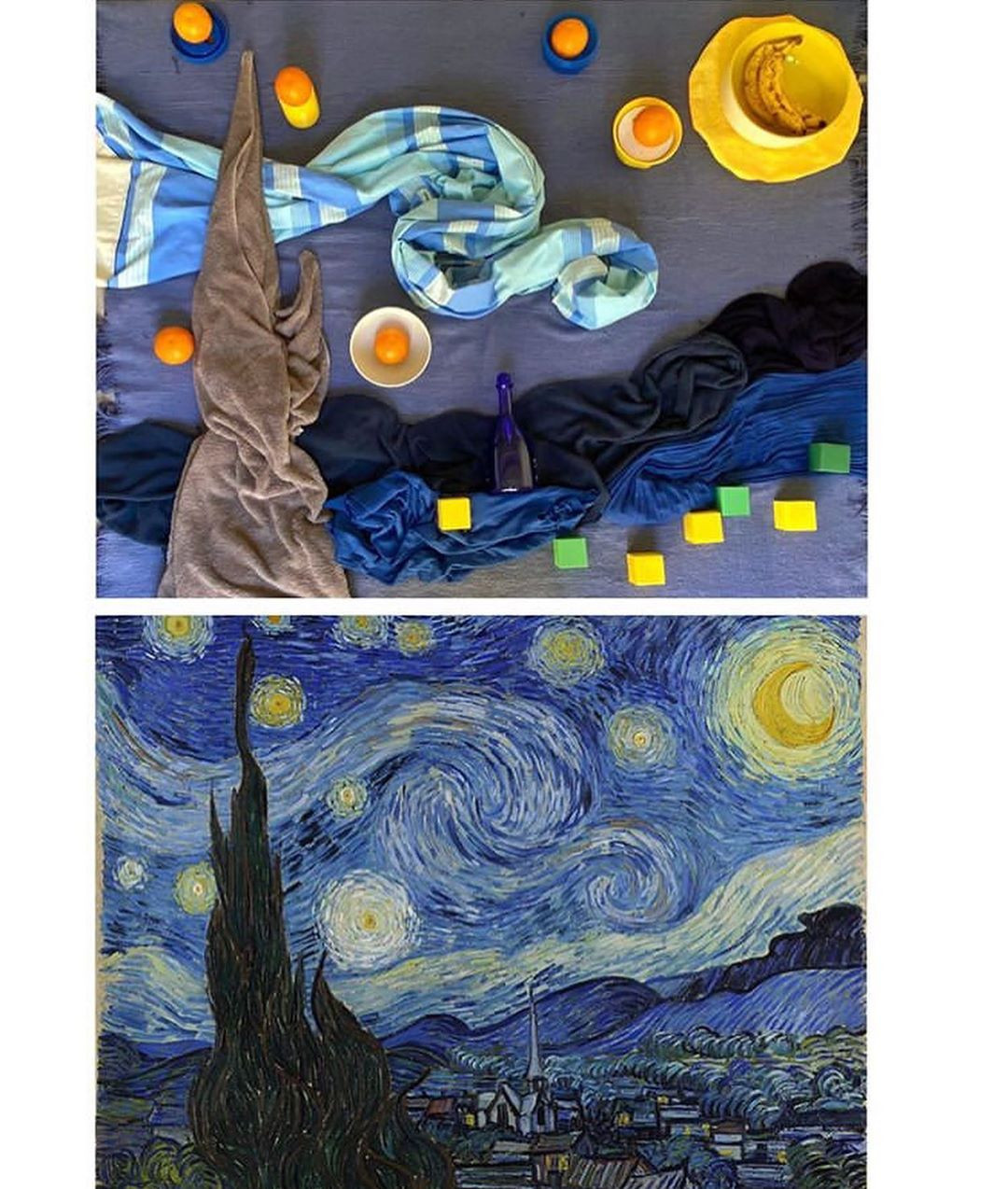 Bức "Đêm đầy sao” của Van Gogh khắc họa bầu trời đêm nổi tiếng nhất trong thế giới hội họa, được dân mạng tái hiện khá nhiều.