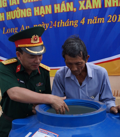 Tiếp tục chuỗi hoạt động “Thanh niên Quân đội chung tay góp sức cùng đồng bào các tỉnh miền Trung, Tây Nguyên và Đồng bằng Sông Cửu Long khắc phục hạn hán, xâm nhập mặn” tại một số địa phương trên địa bàn các Quân khu 5, 7, 9, sáng 24/4, tại huyện Cần Đước (Long An), Ban Thanh niên Quân đội phối hợp với cơ quan chính trị Quân khu 7, Quân đoàn 4, Bộ Chỉ huy Quân sự tỉnh, Tỉnh đoàn Long An và công ty Tecapro (Bộ Quốc phòng) tổ chức trao tặng nhiều phần quà và vật dụng thiết thực cho người dân địa phương.