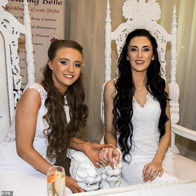 Hai cô gái trao nhau nụ hôn ngọt ngào trong hôn lễ diễn ra tại khách sạn Loughshore ở Carrickfergus.