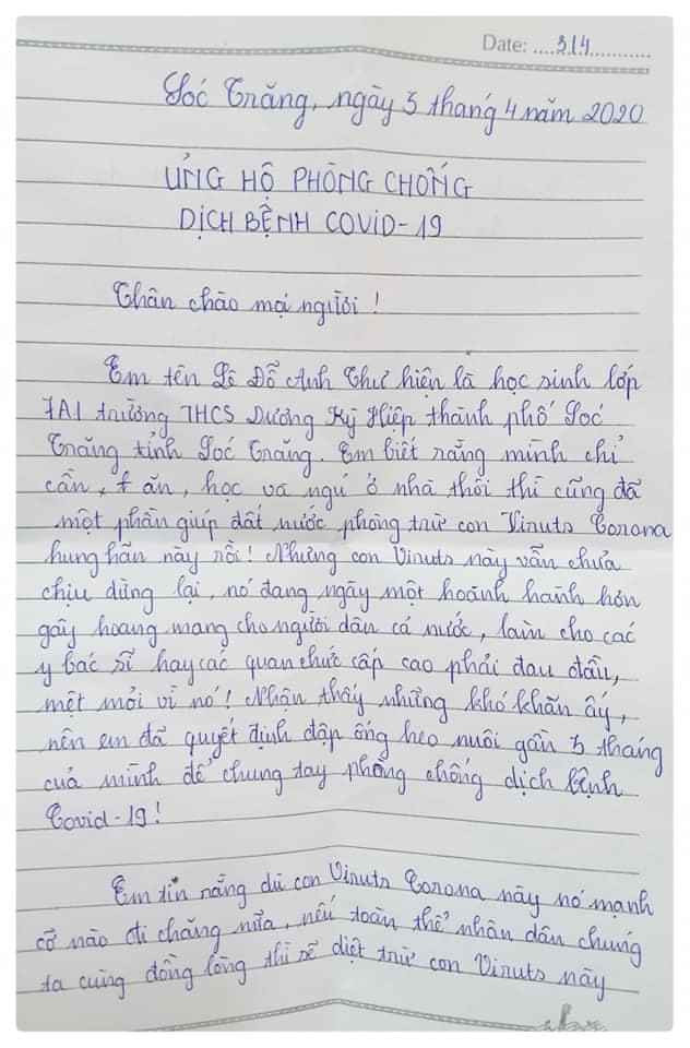 Em Lê Đỗ Anh Thư (học sinh lớp 7A1, Trường THCS Dương Kỳ Hiệp, TP Sóc Trăng, tỉnh Sóc Trăng) chia sẻ trong bức thư gửi Ủy ban Mặt trận Tổ quốc Việt Nam tỉnh Sóc Trăng: Mình chỉ cần ăn, học và ngủ ở nhà thôi thì cũng đã một phần giúp đất nước phòng trừ virus corona hung hãn này rồi. Nhưng con virus này vẫn chưa chịu dừng lại, nó đang ngày một hoành hành hơn gây hoang man cho người dân cả nước; đồng thời làm cho các y bác sỹ hay các quan chức cấp cao phải đau đầu, mệt mỏi vì nó. Nhận thấy những khó khăn ấy nên em đã quyết định đập ống heo nuôi gần 3 tháng của mình để chung tay phòng chống dịch COVID - 19.