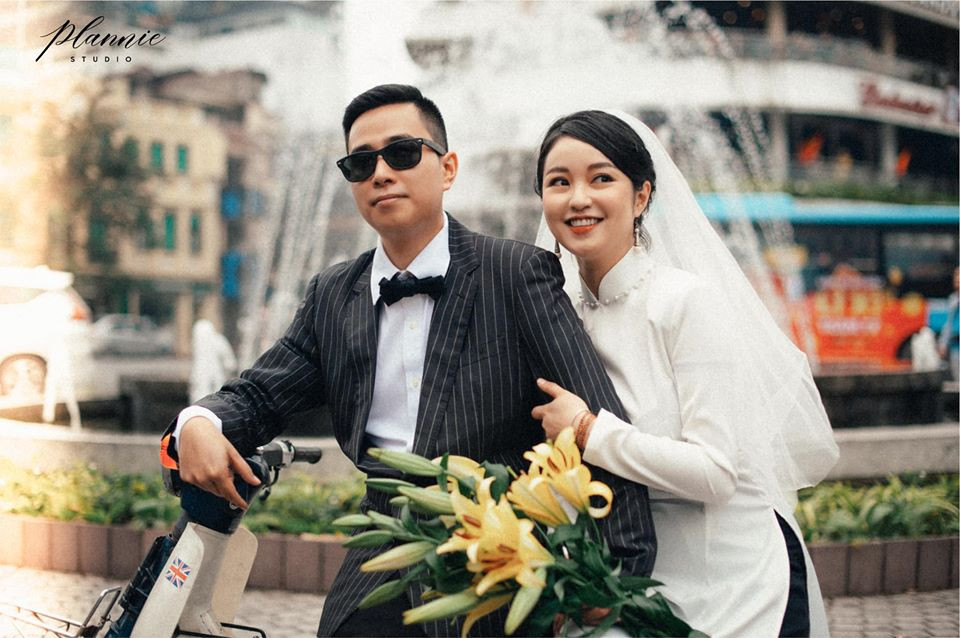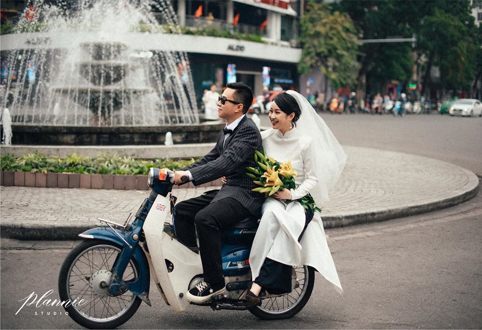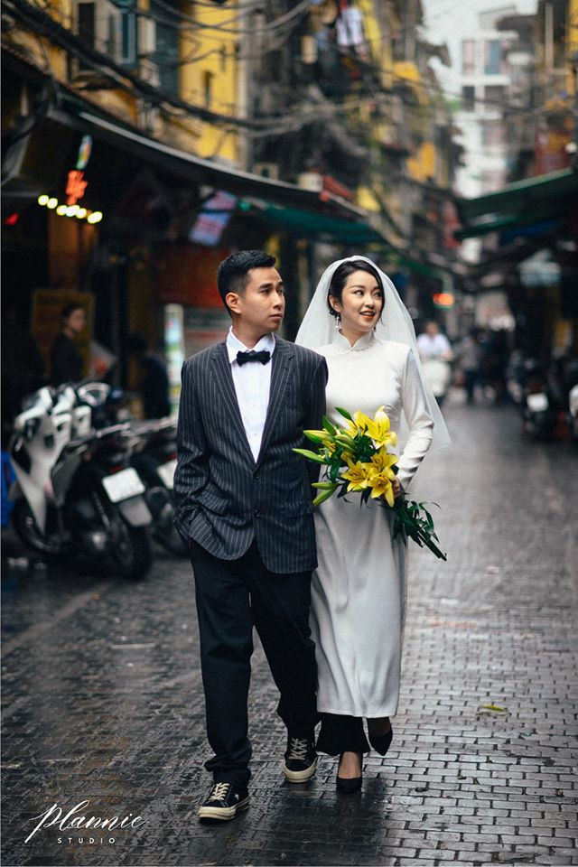 Cô dâu diện áo dài trắng tinh khôi, chú rể diện vest đi giày thể thao... vừa có nét cổ điển pha lẫn chút hiện đại của giới trẻ.