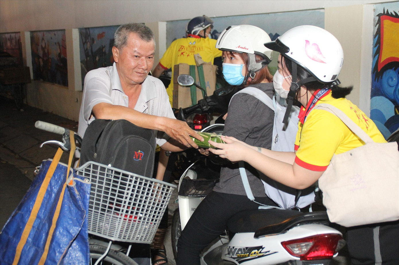 Năm nay, các bạn sinh viên Trường Đại học Bách khoa (Đại học Quốc gia TPHCM) đã chọn một điểm gần trường để tiến hành công việc này. Sau khi vớt bánh khỏi xoong và ép bánh, sửa soạn tươm tất, nhóm bạn trẻ trong đồng phục “áo vàng” của chiến dịch “Xuân tình nguyện” tập trung tại cổng chính của trường để cùng đi chia sẻ cho những người dân trên đường phố. Hàng chục chiếc bánh chưng vừa ra lò được các bạn trẻ gửi tặng đến những người nghèo trên đường phố trong đêm se lạnh khiến nhiều người cảm động. Đón nhận những chiếc bánh chưng ấm tình người, một số người vô gia cư thưởng thức ngay rồi khen ngợi không ngớt lời.