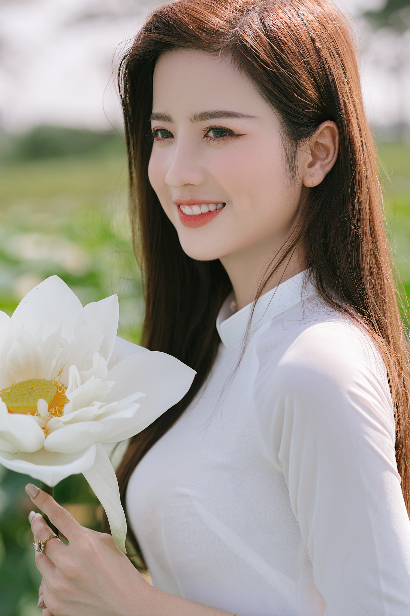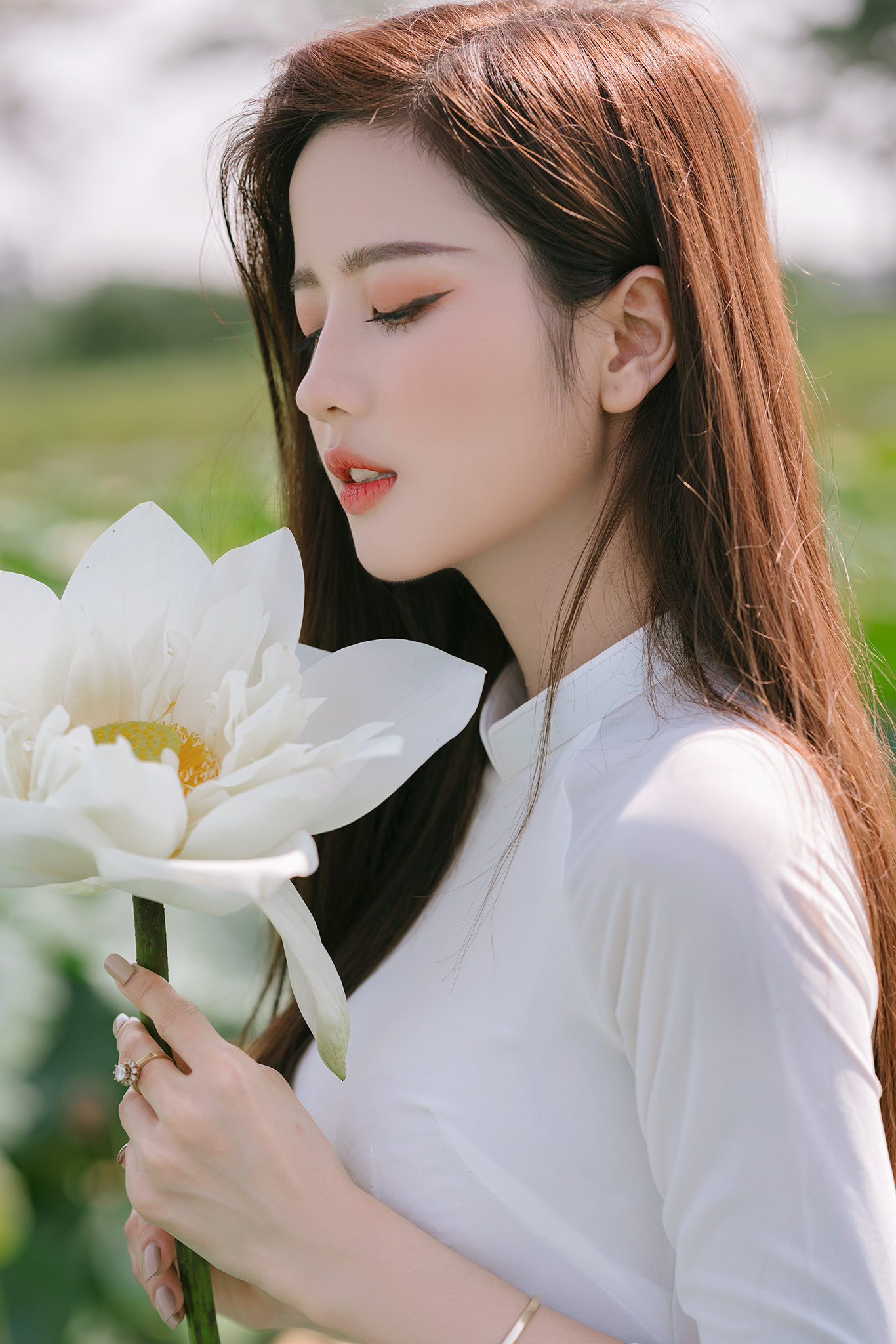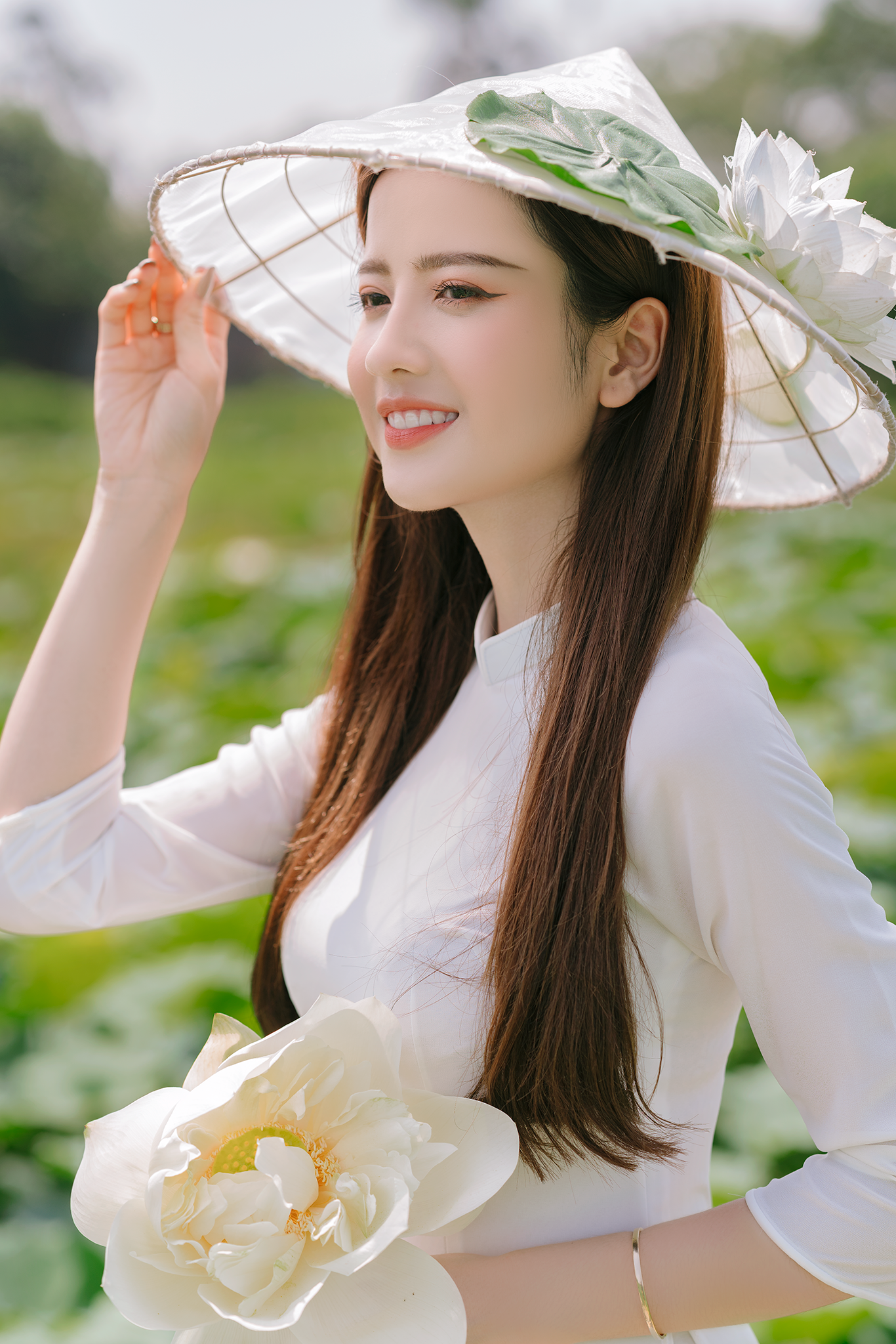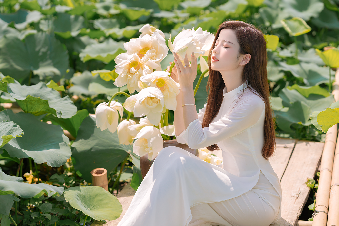 Hình ảnh thiếu nữ áo dài trắng đội nón lá bên đầm bạch liên dịu dàng tinh khôi nền nã khiến người xem thật sự rung động.