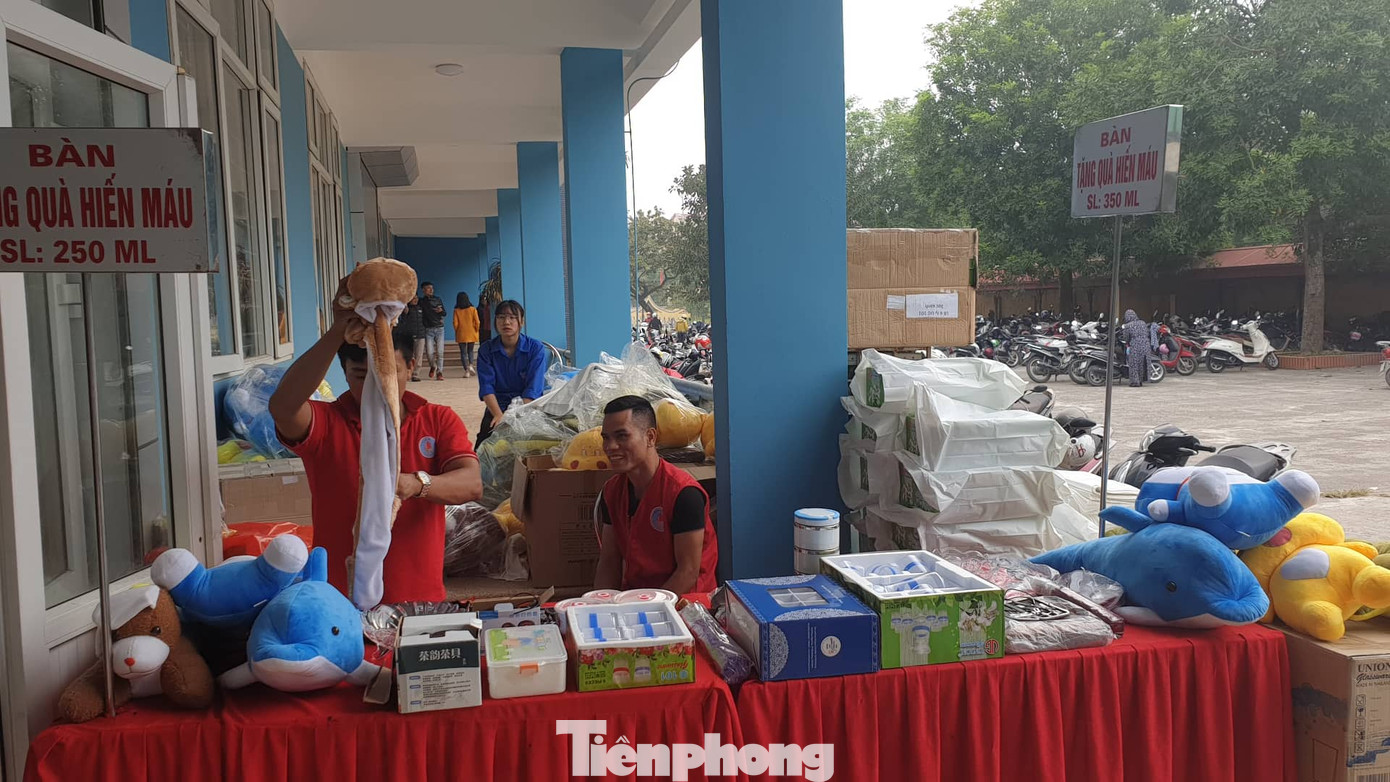 "Ngoài các TNV đã đăng ký tham gia hiến máu, chúng tôi còn mời người dân, học sinh các trường học đến dự để tuyên truyền về tính nhân văn, nhân đạo của hành động hiến máu cứu người. Lãnh đạo huyện và đại diện các ban ngành của huyện đều đến cảm ơn, động viên những người hiến máu", Phó Bí thư Huyện đoàn Duy Tiên, chị Vũ Thị Huyền Trang lý giải về hình ảnh "đông như hội" của Ngày Chủ Nhật Đỏ lần này.