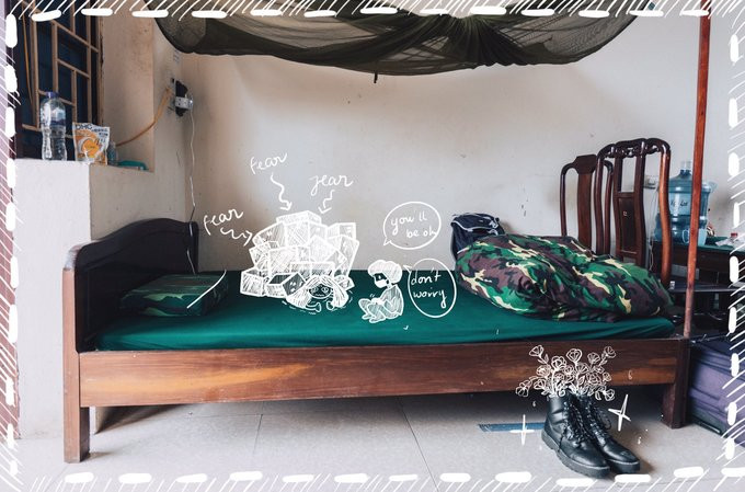 Linh ở trong căn phòng dành cho bốn người, sạch sẽ và đầy đủ đồ dùng, từ "chăn ấm, đệm êm" đến đôi dép tổ ong. "Được trang bị từ A đến Z thế này mà không khoẻ mạnh để bảo vệ Tổ quốc thì thật có lỗi", cô nói. Ở cùng Linh có hai cô gái khác cũng từ Milan trở về. Linh gọi họ là "hai cô tiên nhỏ". "Cả hai cô đều có tâm hồn ăn uống với đồ ăn được tiếp tế liên tục nên mình cũng không lo bị đói lắm", Linh dí dỏm nói thêm.
