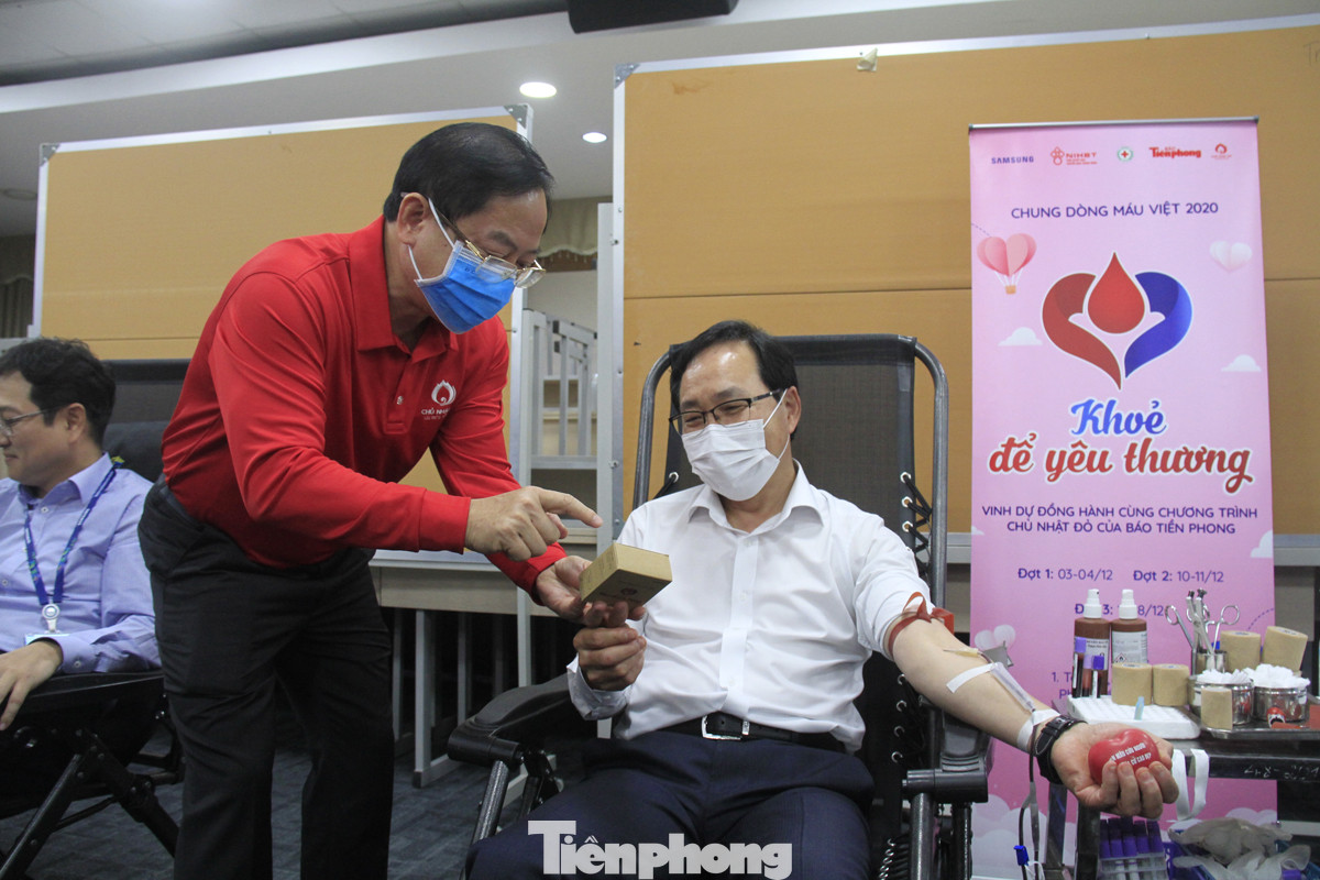 Tổng Biên tập báo Tiền Phong Lê Xuân Sơn tặng phần quà nhỏ cho ông Choi Joo Ho, Tổng Giám đốc Tổ hợp Samsung Việt Nam. Được biết, đây là lần thứ hai ông Choi Joo Ho hiến máu tại Việt Nam.