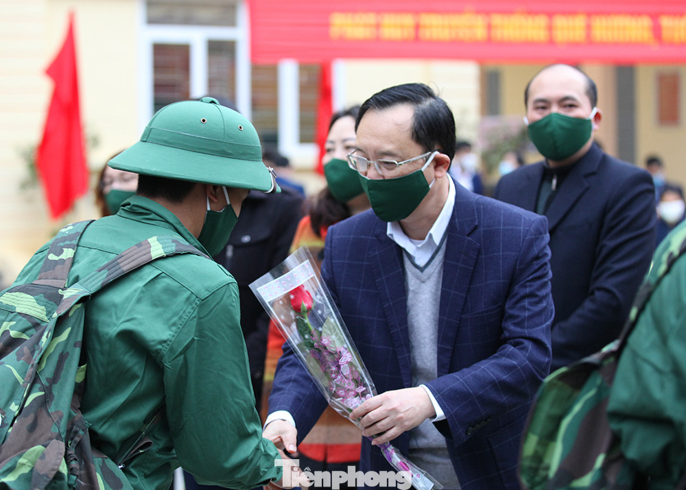 Đồng chí Vương Ngọc Hà - Phó Trưởng đoàn đại biểu Quốc hội khóa XIV tỉnh, Bí thư Huyện ủy cùng các đồng chí lãnh đạo huyện chúc mừng và động viên các tân binh trước khi trở về đơn vị