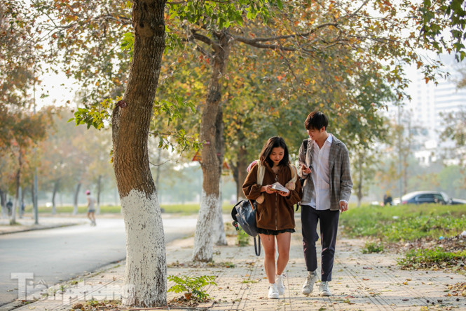 Đôi bạn sinh viên bước đi dưới tán phong.