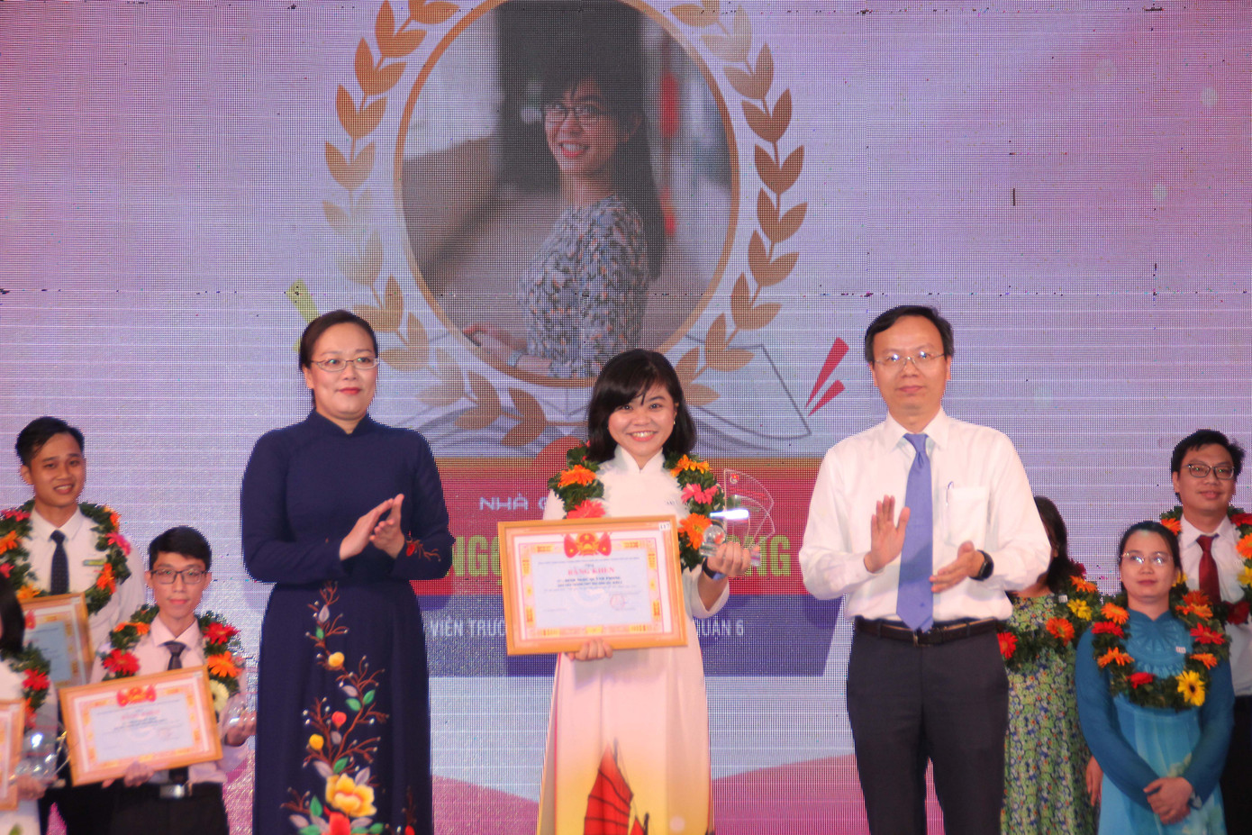 Phó Bí thư Thành ủy, Chủ tịch HĐND TPHCM Nguyễn Thị Lệ (bìa phải) và Bí thư Thành Đoàn TPHCM trao bằng khen và biểu trưng tuyên dương các tấm gương nhà giáo trẻ.