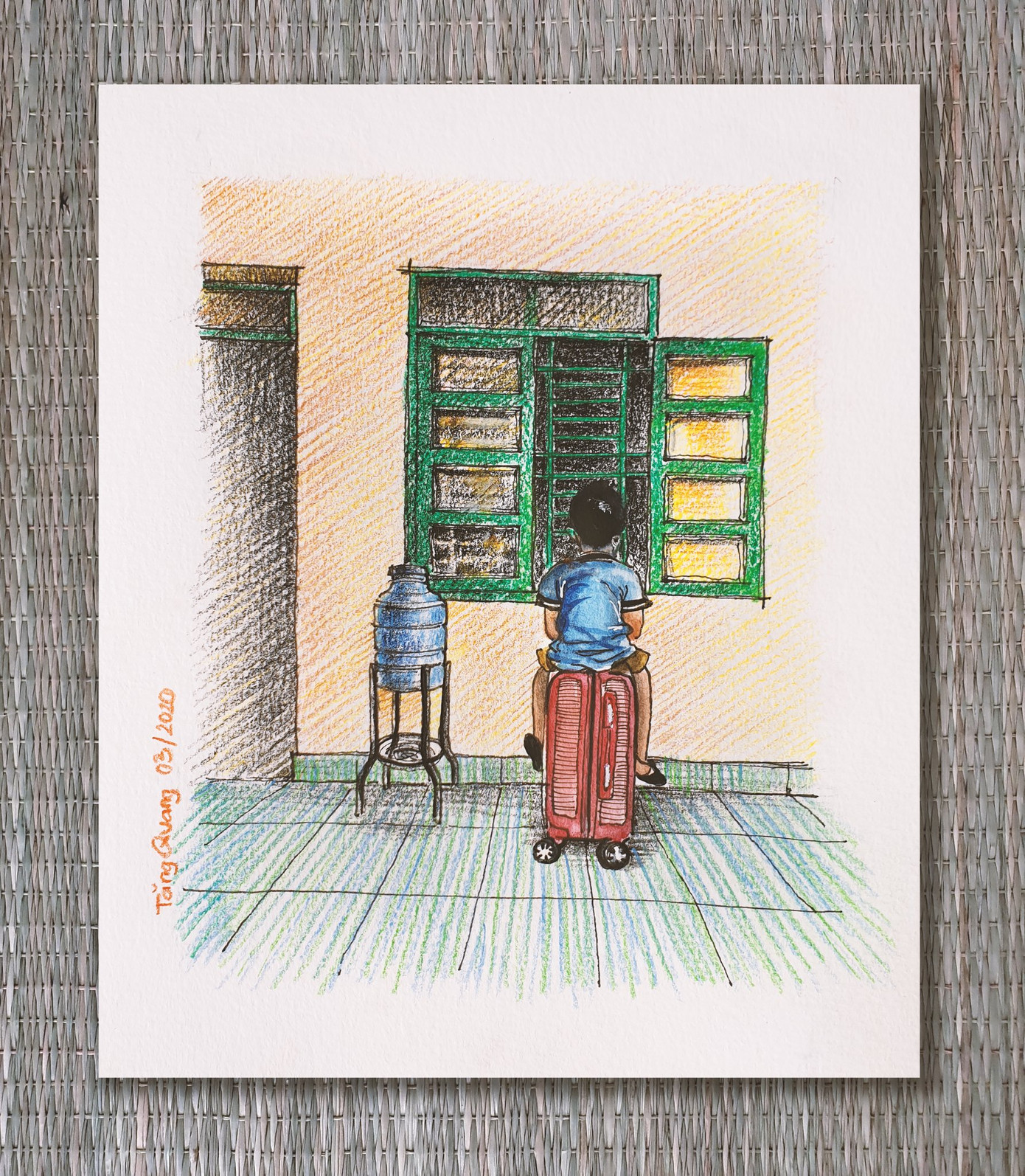 Còn em bé này thì sáng sáng kéo va ly ra ngồi bên bệ cửa sổ, vừa phơi nắng vừa xem hoạt hình.