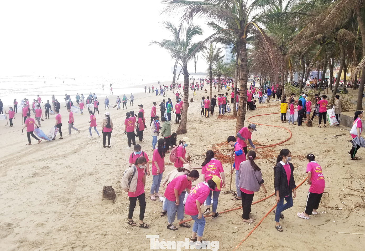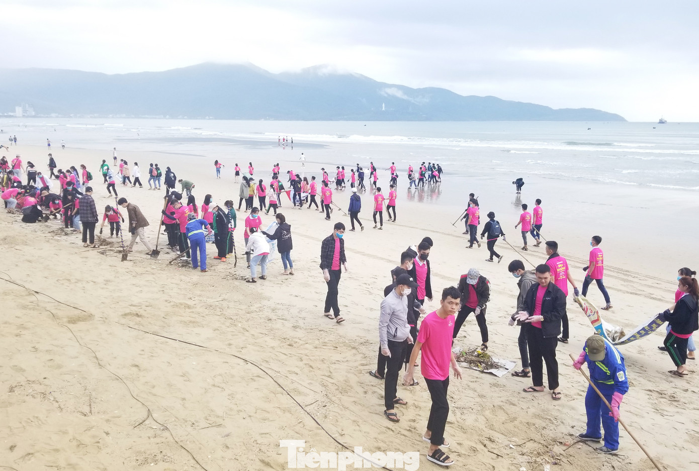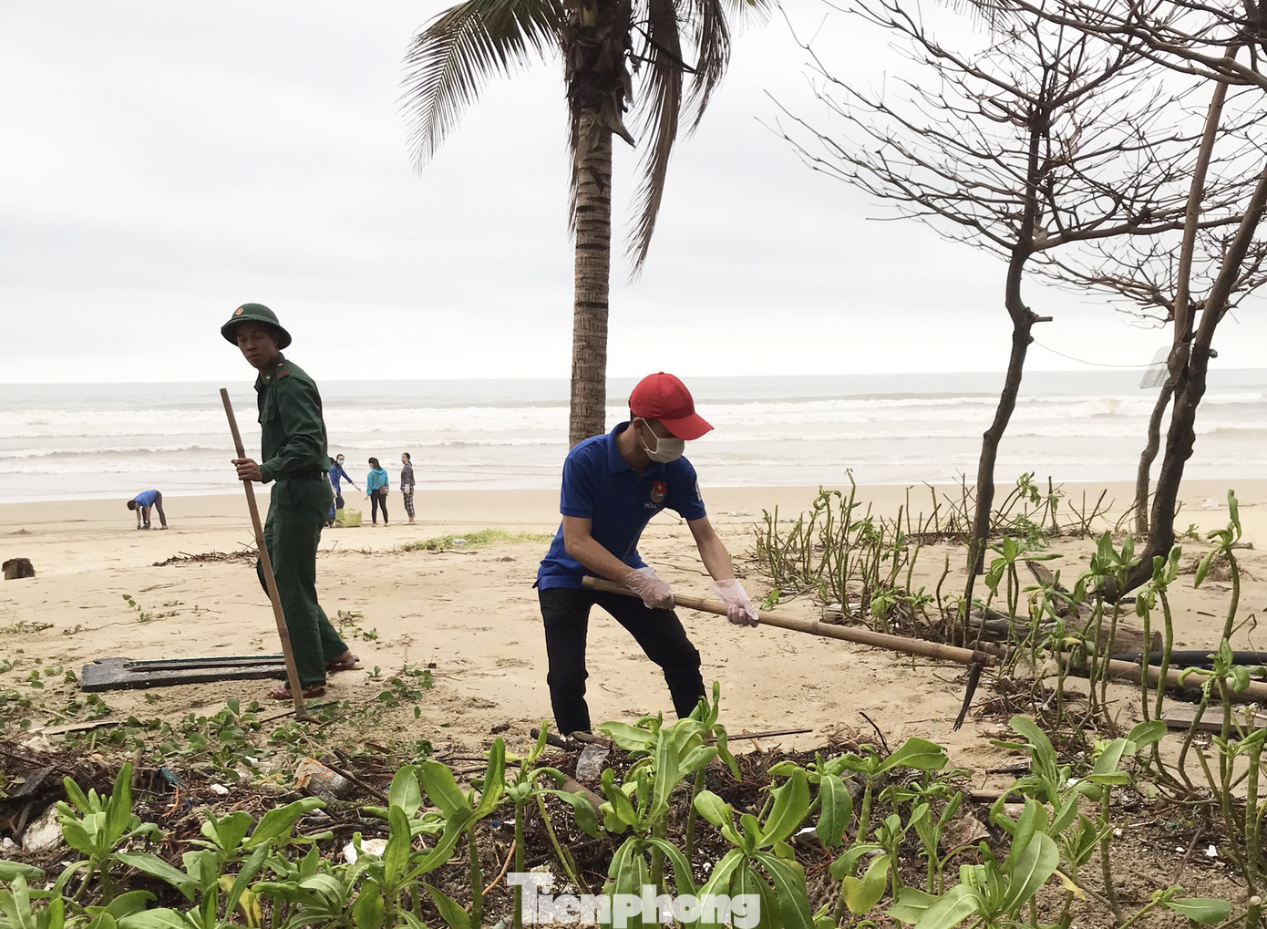 Lực lượng đoàn viên thanh niên đã chia thành từng nhóm, tiến hành dọn dẹp rác thải trên bãi biển ở từng khu vực.