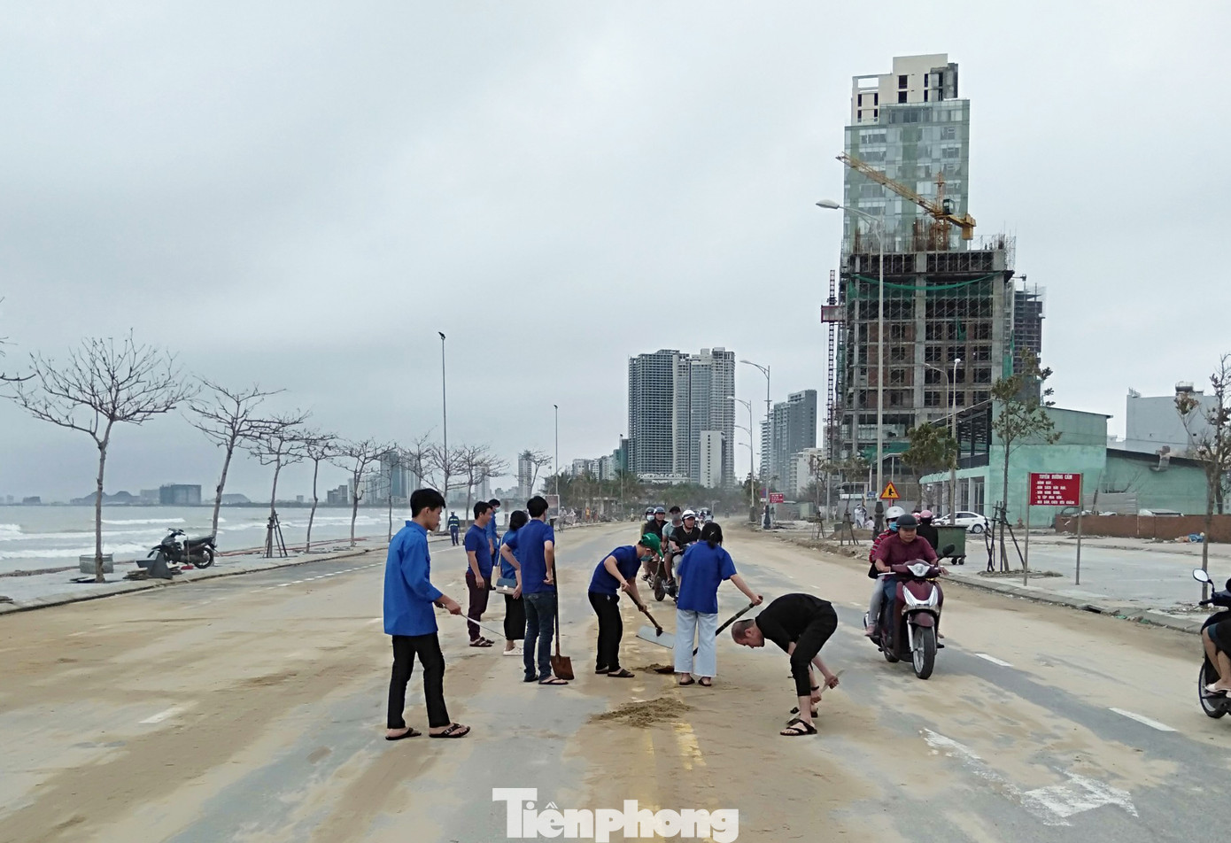 Không chỉ dọn rác ở khu vực bãi biển, lực lượng đoàn viên thanh niên còn tiến hàng dọn cát bay phủ đầy đường biển Hoàng Sa, Nguyễn Tất Thành.... để đảm bảo an toàn cho người dân khi lưu thông.